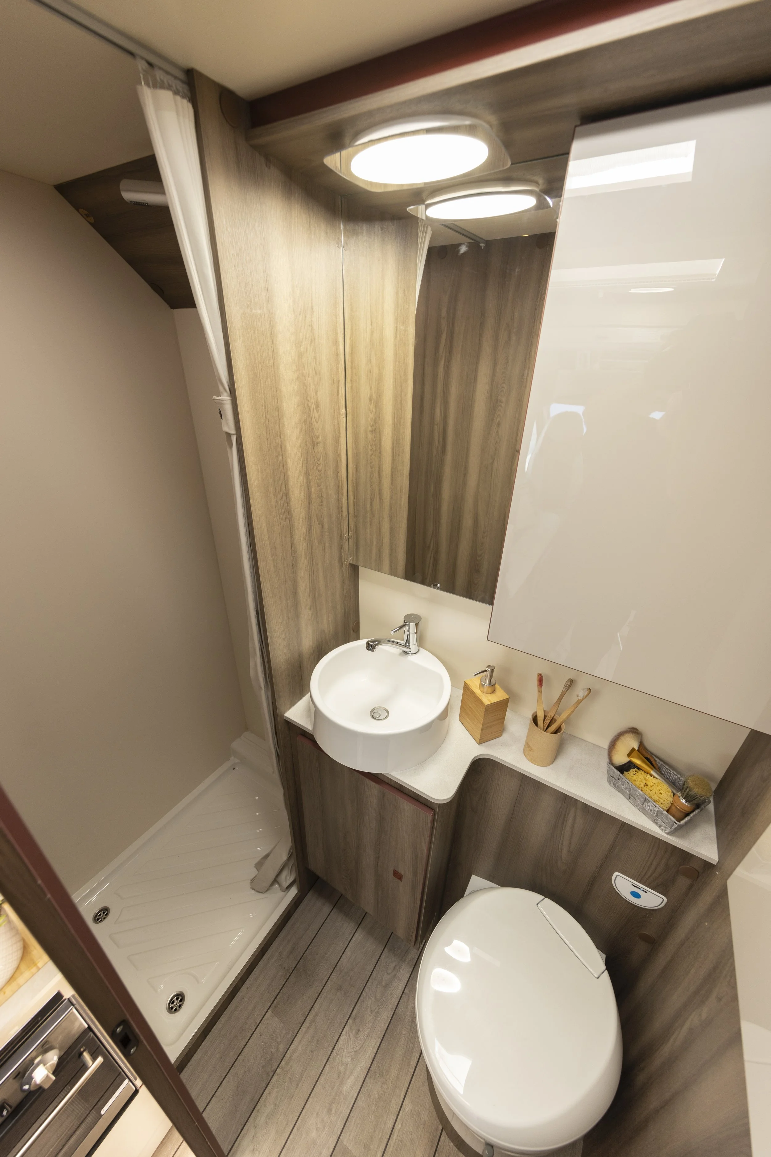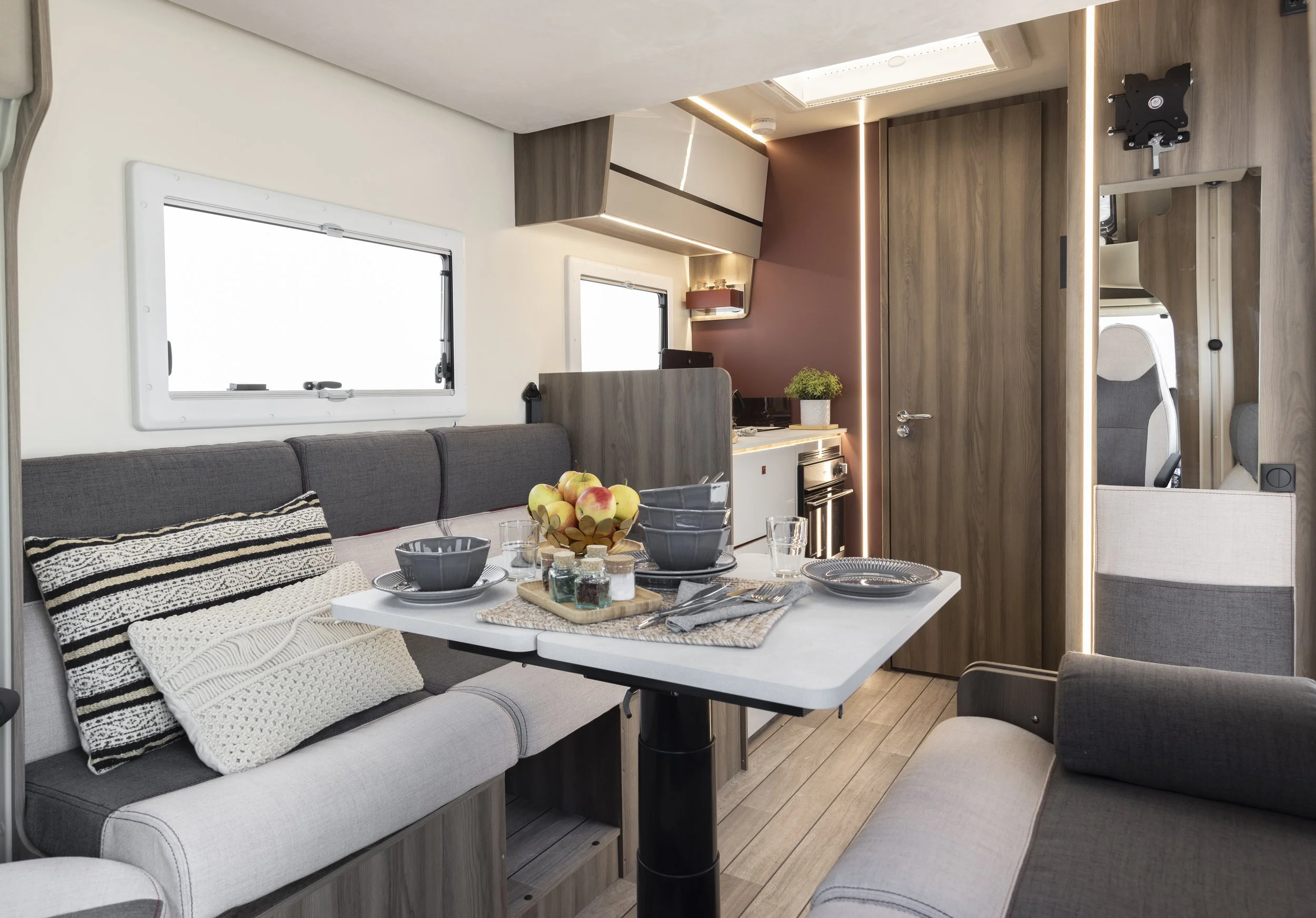 The Roller Team Kronos 590 is a smart, compact motorhome measuring just 5.99 m in length — perfect for navigating both country lanes and urban streets. Built on a Ford Transit chassis, it offers the practicality of a campervan with the comforts of a coach-built: a cozy lounge, drop-down bed, full bathroom with separate shower, and generous storage solutions.