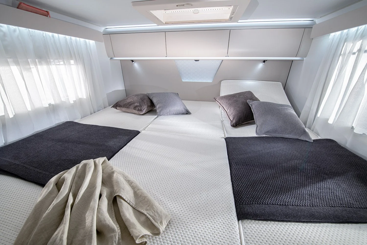 The central washroom is thoughtfully designed, offering both a shower cubicle and a separate toilet with vanity, providing privacy and practicality. At the rear, twin fixed single beds can be converted into a large double, sitting above a generous garage space ideal for storing luggage, sports gear, or outdoor equipment.