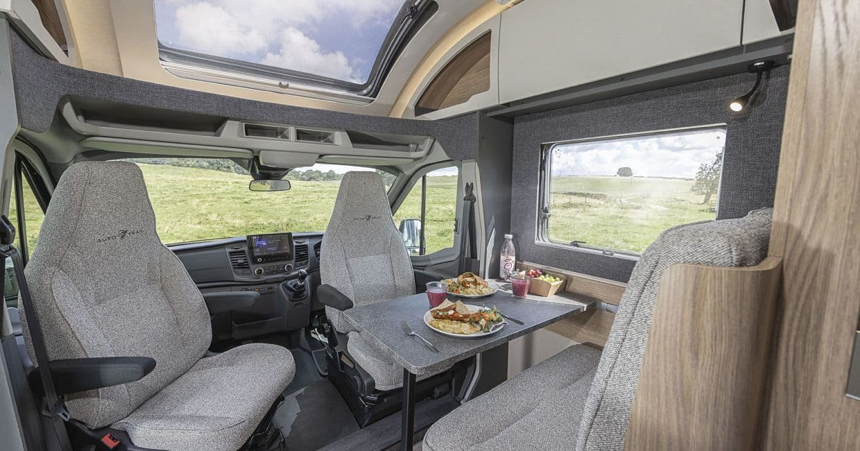 Up front, a half‑dinette converts into an additional single bed, while swivel cab seats expand the lounge for relaxing and dining.