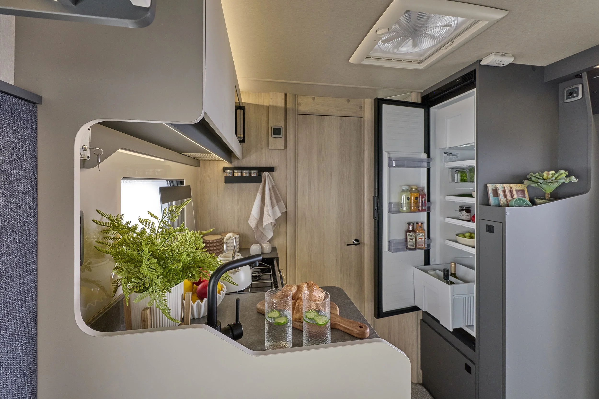 The fully equipped L-shaped kitchen makes mealtimes effortless, featuring a hob, oven/grill, microwave and tall fridge-freezer — ideal for extended adventures. To the rear, a spacious full-width washroom provides a separate shower, toilet and basin for true home-from-home convenience.