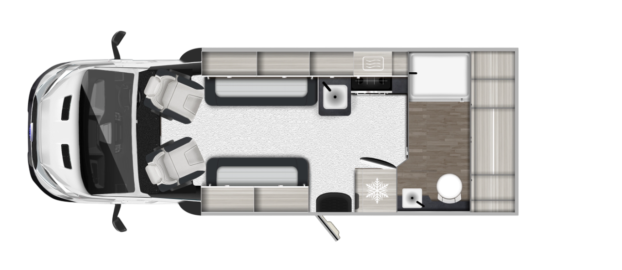 Inside, fixed rear twin beds provide a restful sleeping area and can be complemented by an optional electric drop-down bed above the lounge, delivering up to four berths. The front lounge features swivel captains’ chairs and face-to-face seating, creating a welcoming social space during the day. Complementing this is a well-equipped kitchen and an end washroom with separate shower, ensuring full touring comfort.