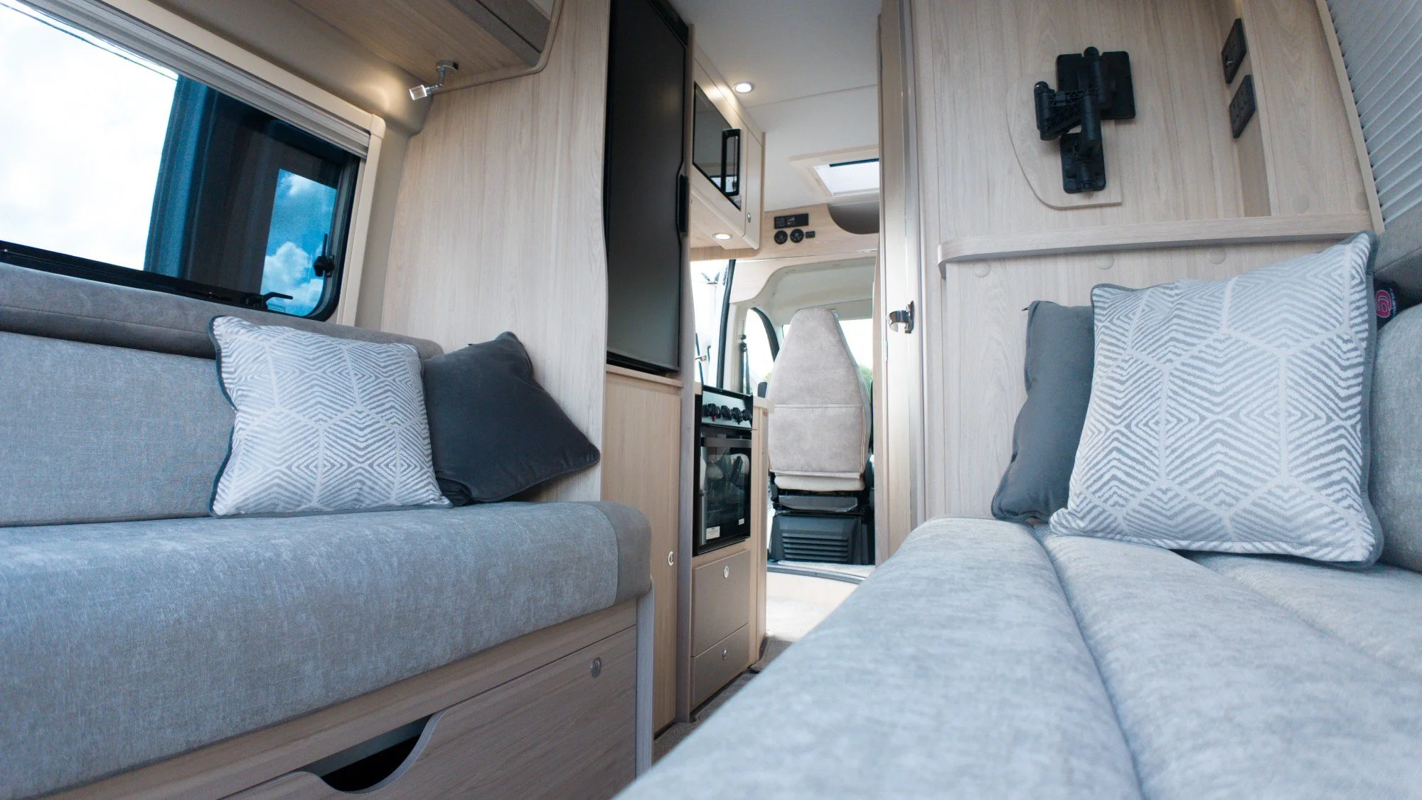 Inside, the layout features two long bench seats at the rear that convert into a cozy double bed, while swivel captain seats up front offer a spacious living area. The kitchen is fully equipped with a dual‑fuel hob, 87 L fridge‑freezer, microwave, and stainless sink with LED-lit worktops.