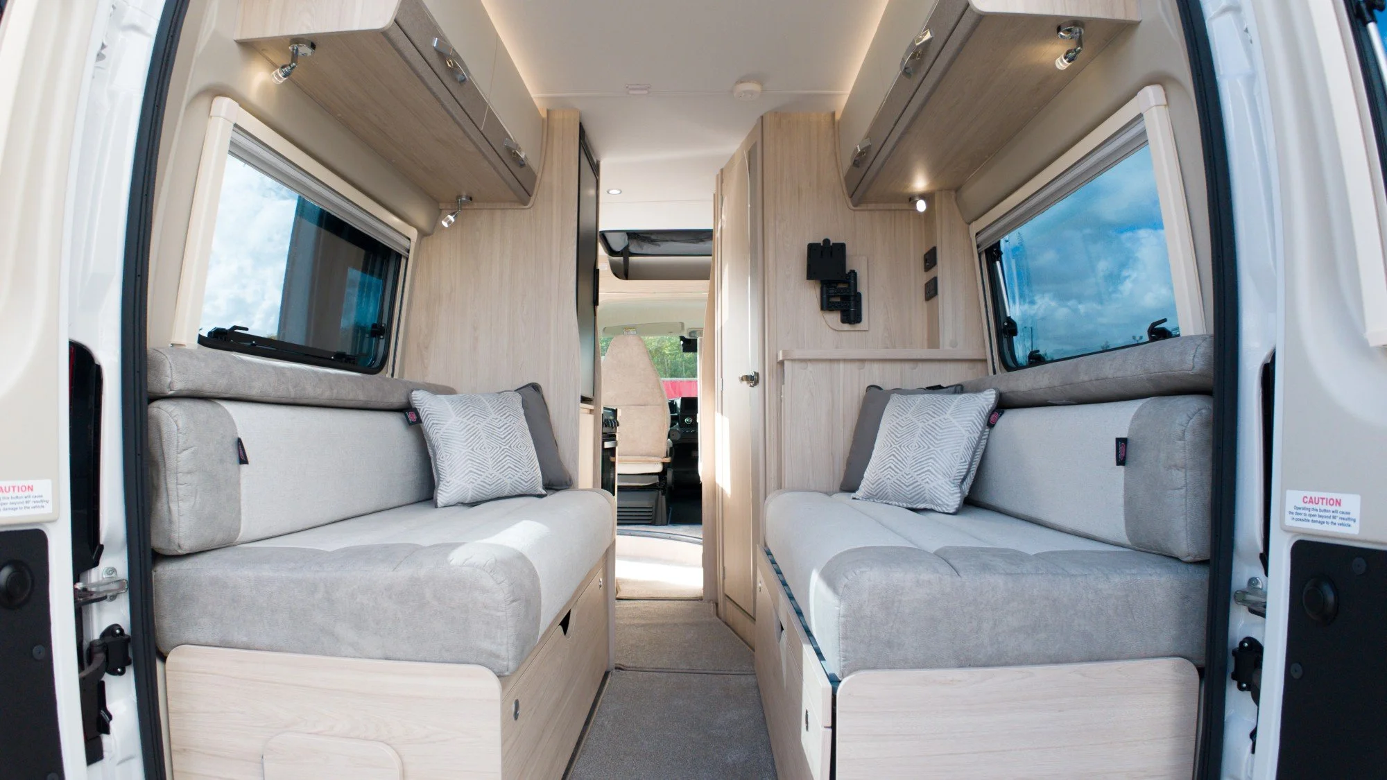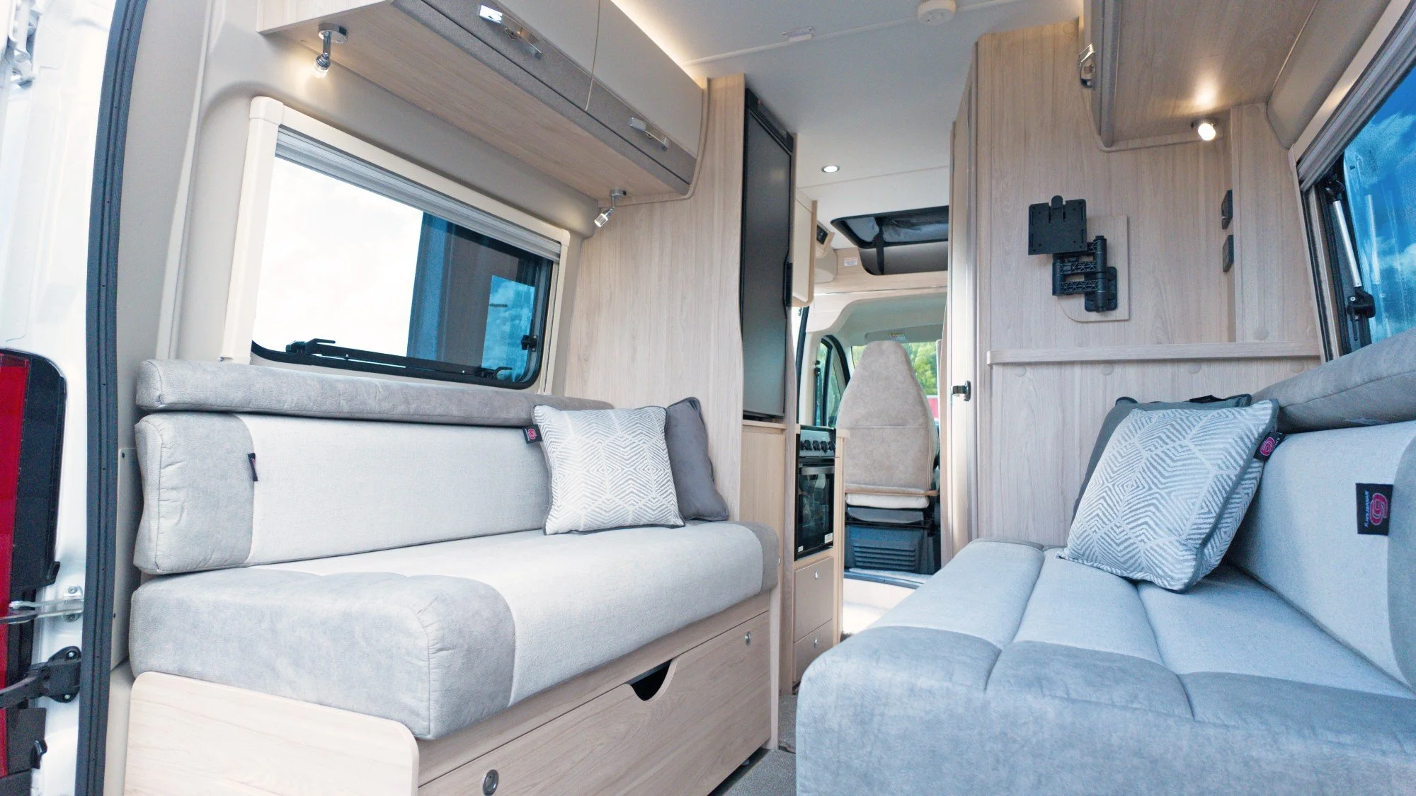 At the rear, a pair of parallel bench seats convert into a comfortable double bed. The front Pullman-style lounge, aided by swivel cab seats and a removable table, doubles as a second dining and sleeping area.