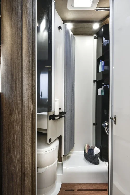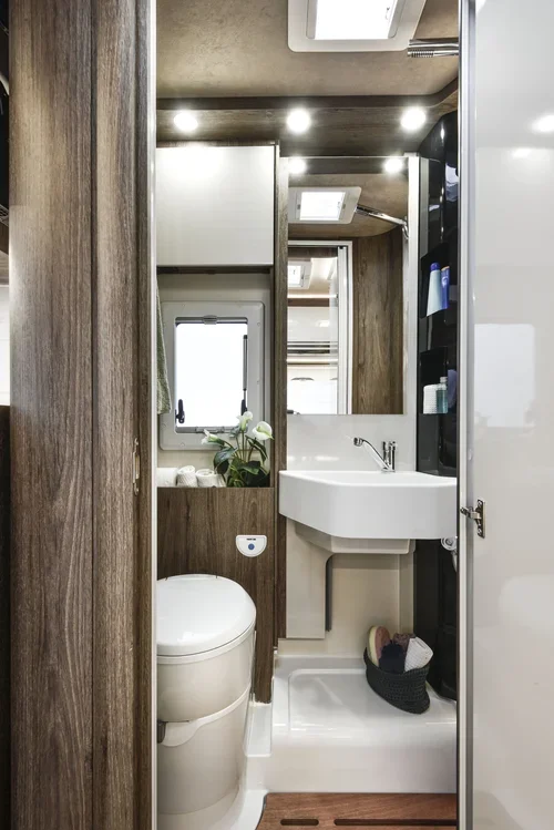 The Roller Team T-Line 700 offers a luxurious and practical layout designed for comfortable touring. At the rear, a spacious island bed creates a true bedroom feel, complete with bedside storage and wardrobes. Moving forward, the split central washroom features a separate shower on one side and a toilet with basin on the other, which can be closed off to form a private dressing area. The mid-kitchen provides everything needed for easy cooking on the go, including a hob, oven, sink, fridge, and plenty of storage. At the front, the bright lounge and dinette offer a relaxing space for dining or unwinding, with an electric drop-down bed above for additional sleeping.