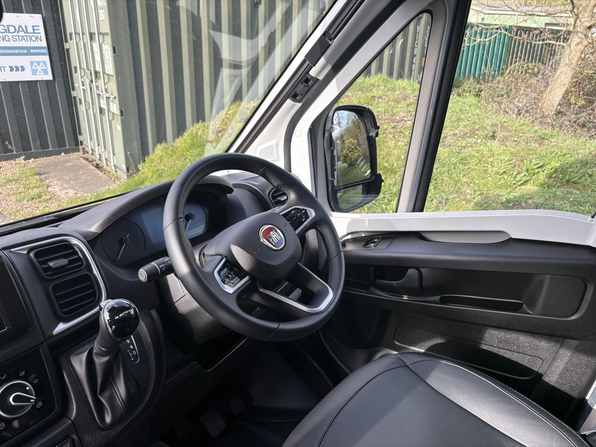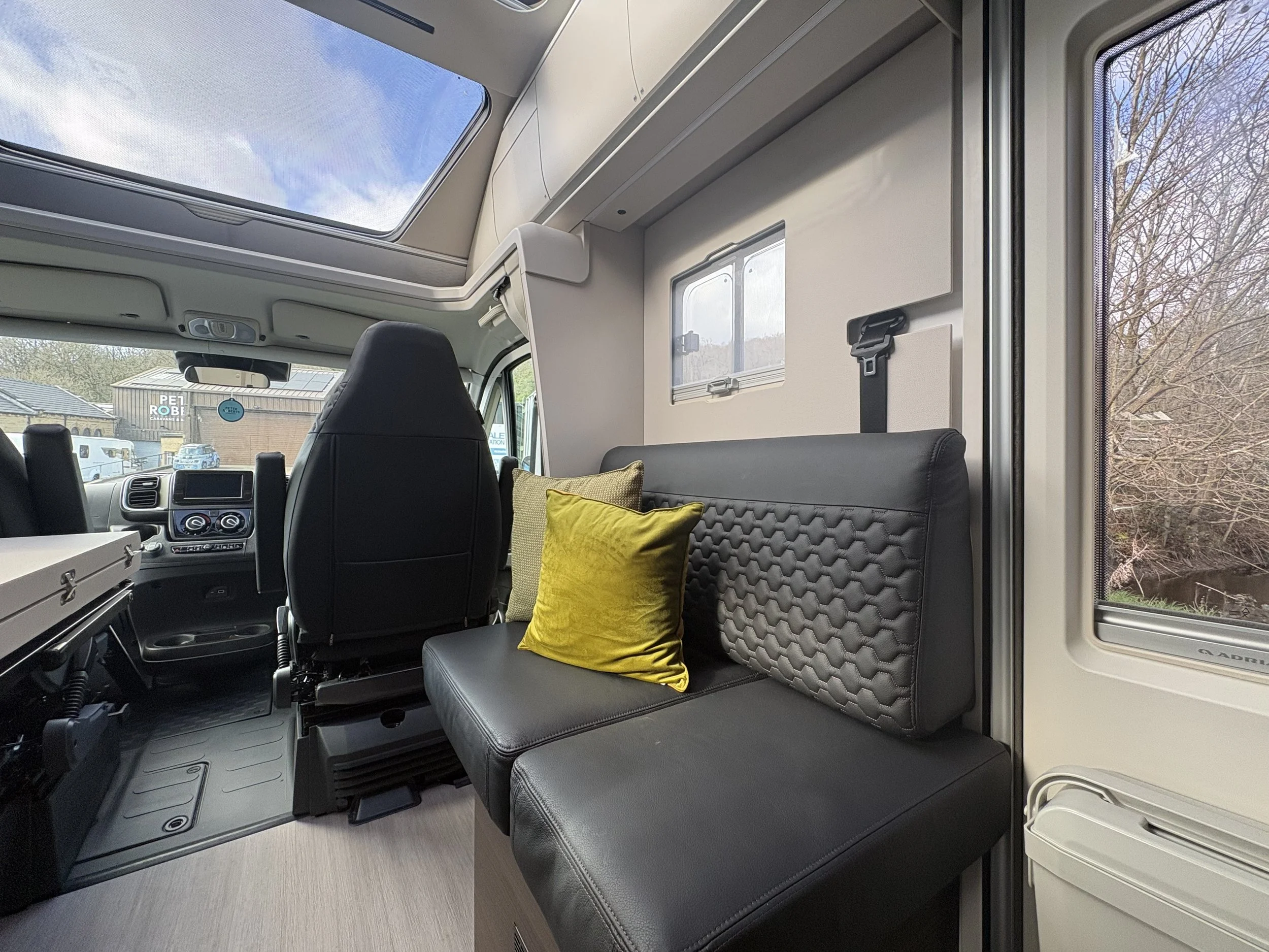 At the front, a bright lounge with twin bench seats and swivel cab chairs creates a spacious, sociable area for relaxing or dining. Large windows and a panoramic rooflight bring in plenty of natural light, enhancing the open feel.