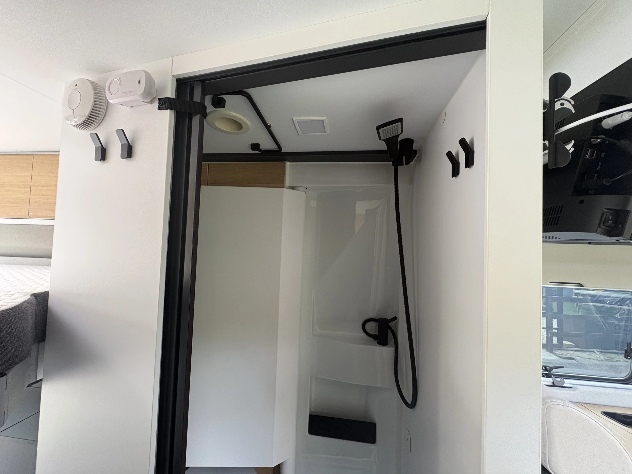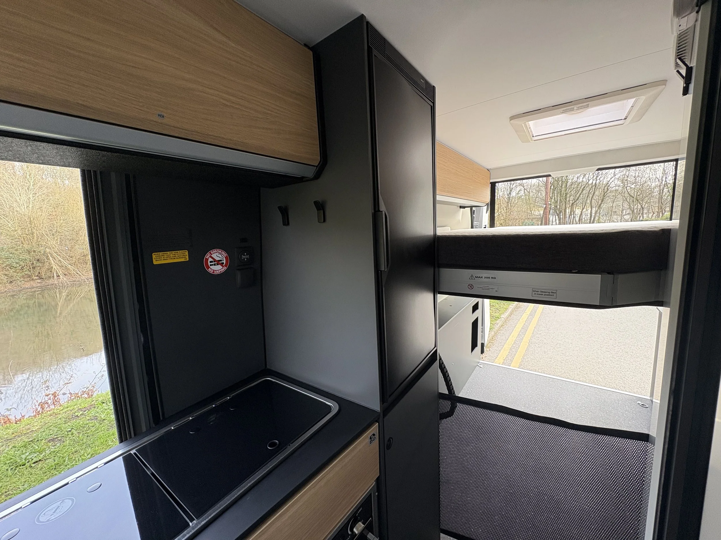 At the rear, the standout feature is the innovative SGX electric drop-down bed. This creates a versatile garage space underneath, perfect for storing bikes or larger items, while still providing a comfortable double bed above.