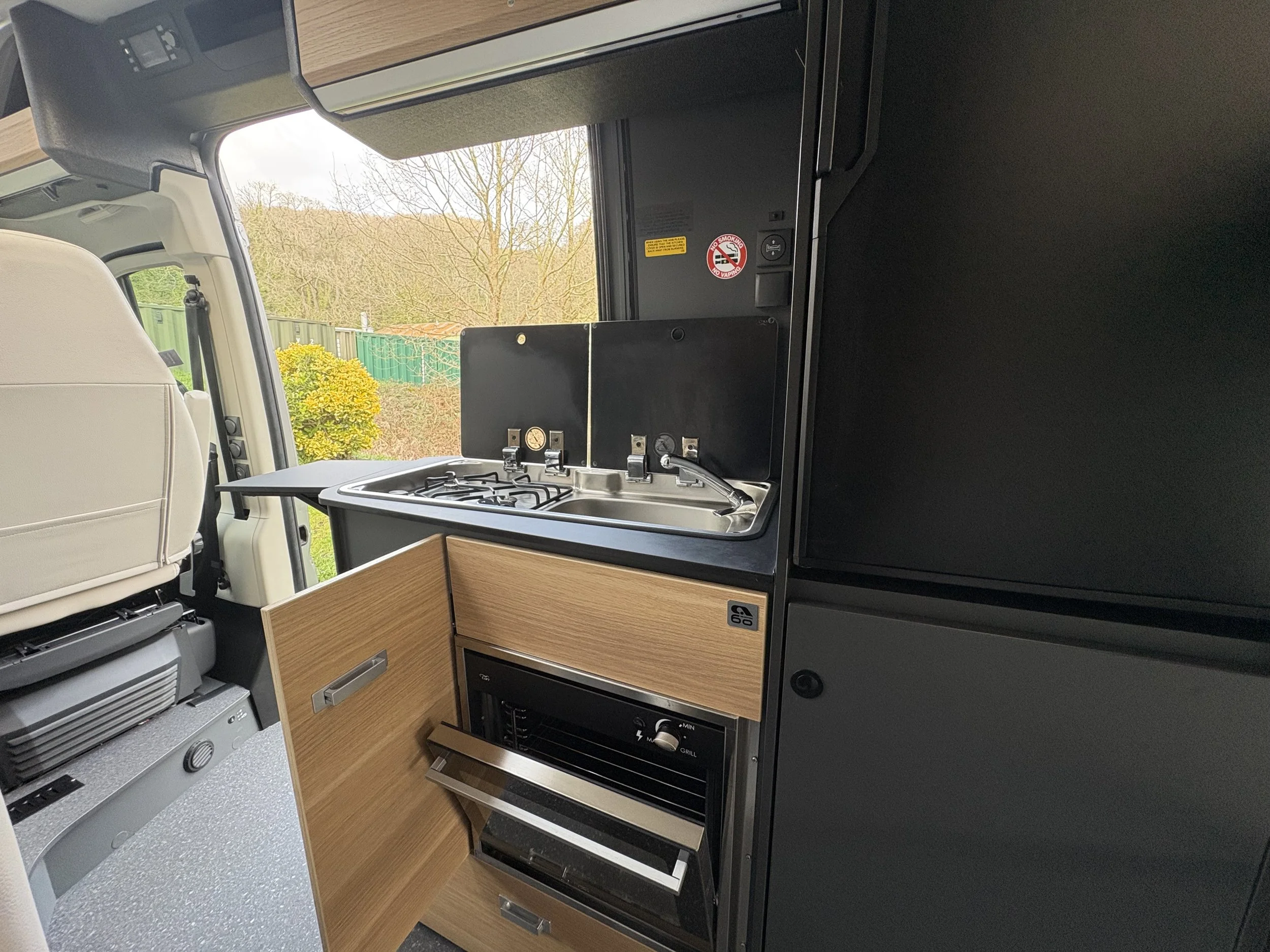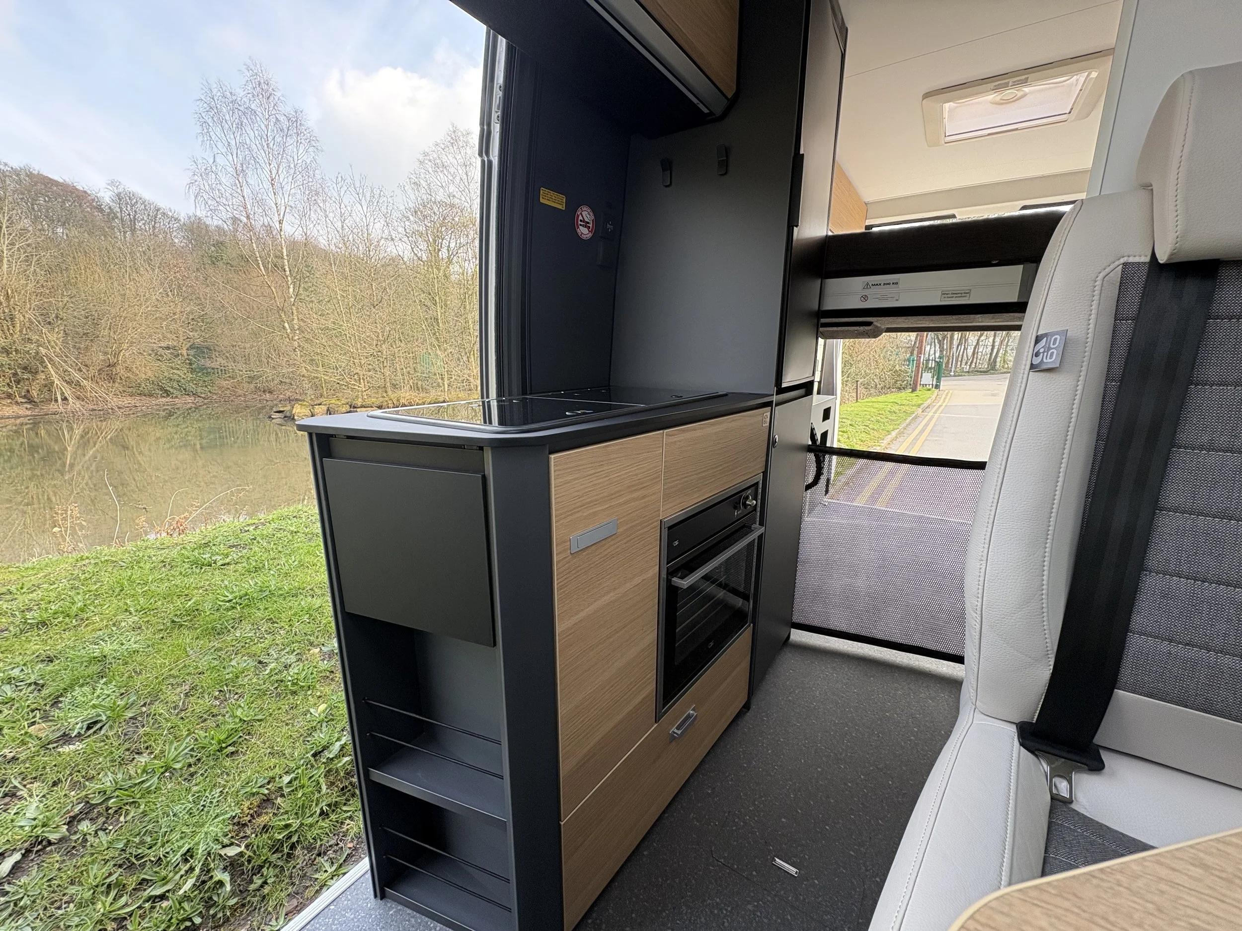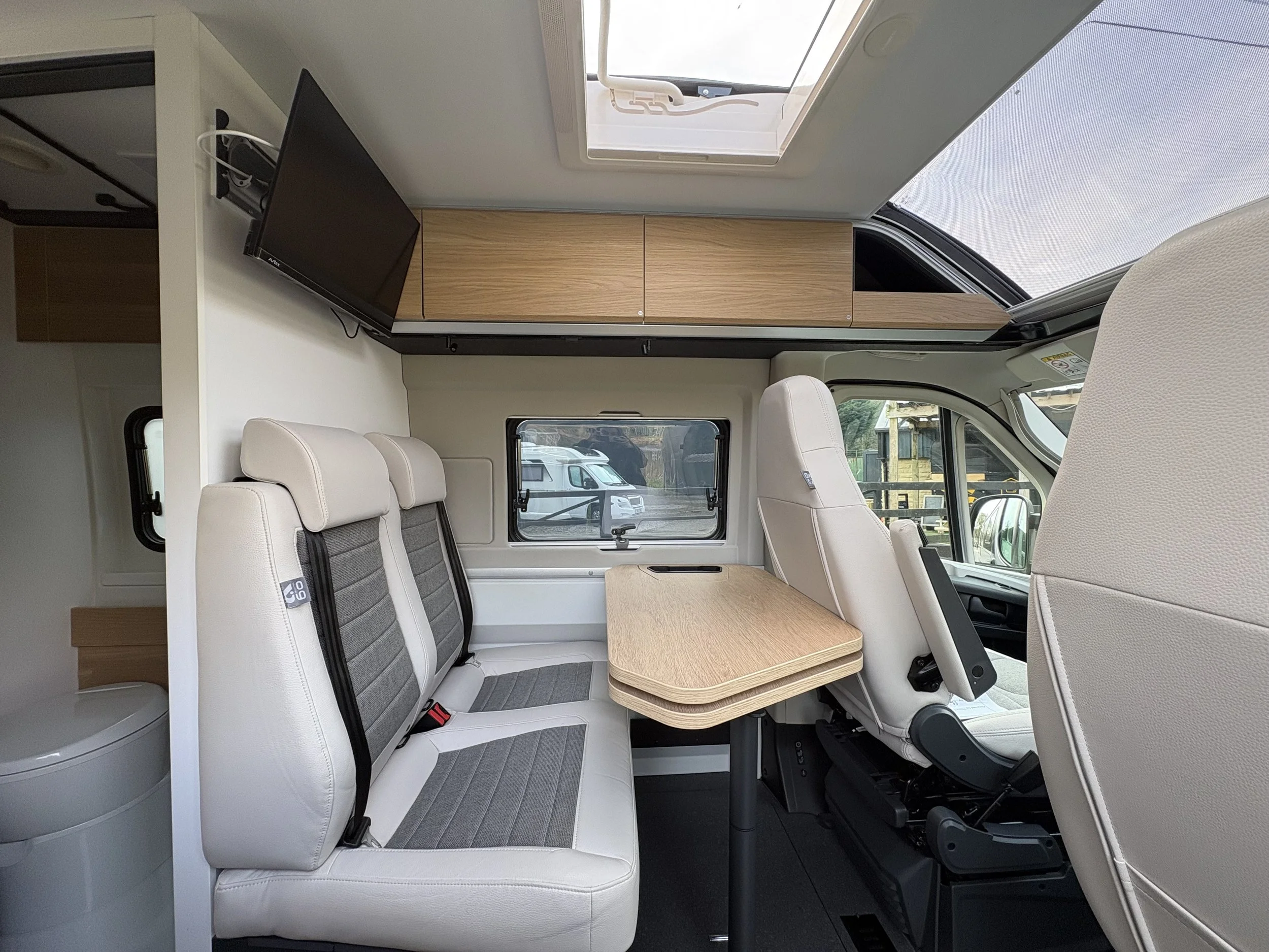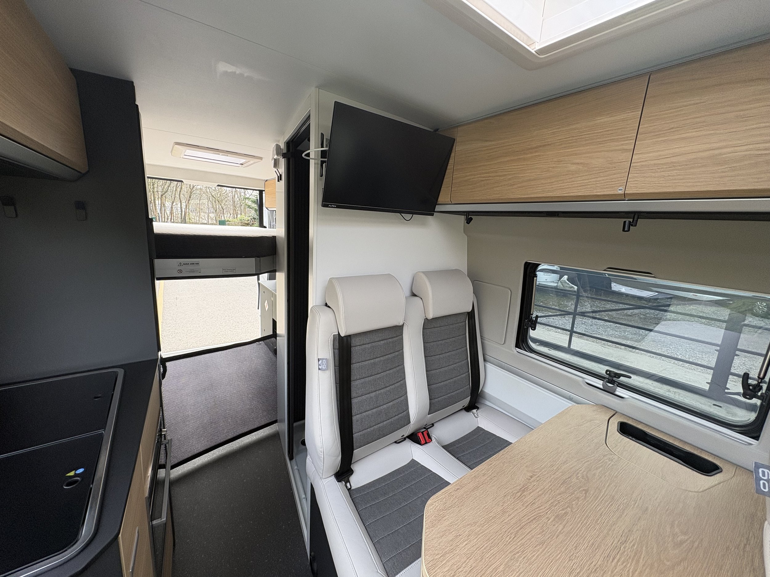 Inside, the layout is both practical and spacious. The front cab seats swivel to form a welcoming lounge and dining area, ideal for relaxing or entertaining. Moving into the centre, you’ll find a well-equipped kitchen featuring a hob, sink, fridge, and ample storage for extended trips. Opposite sits a smart, space-saving washroom with toilet, basin, and shower facilities.