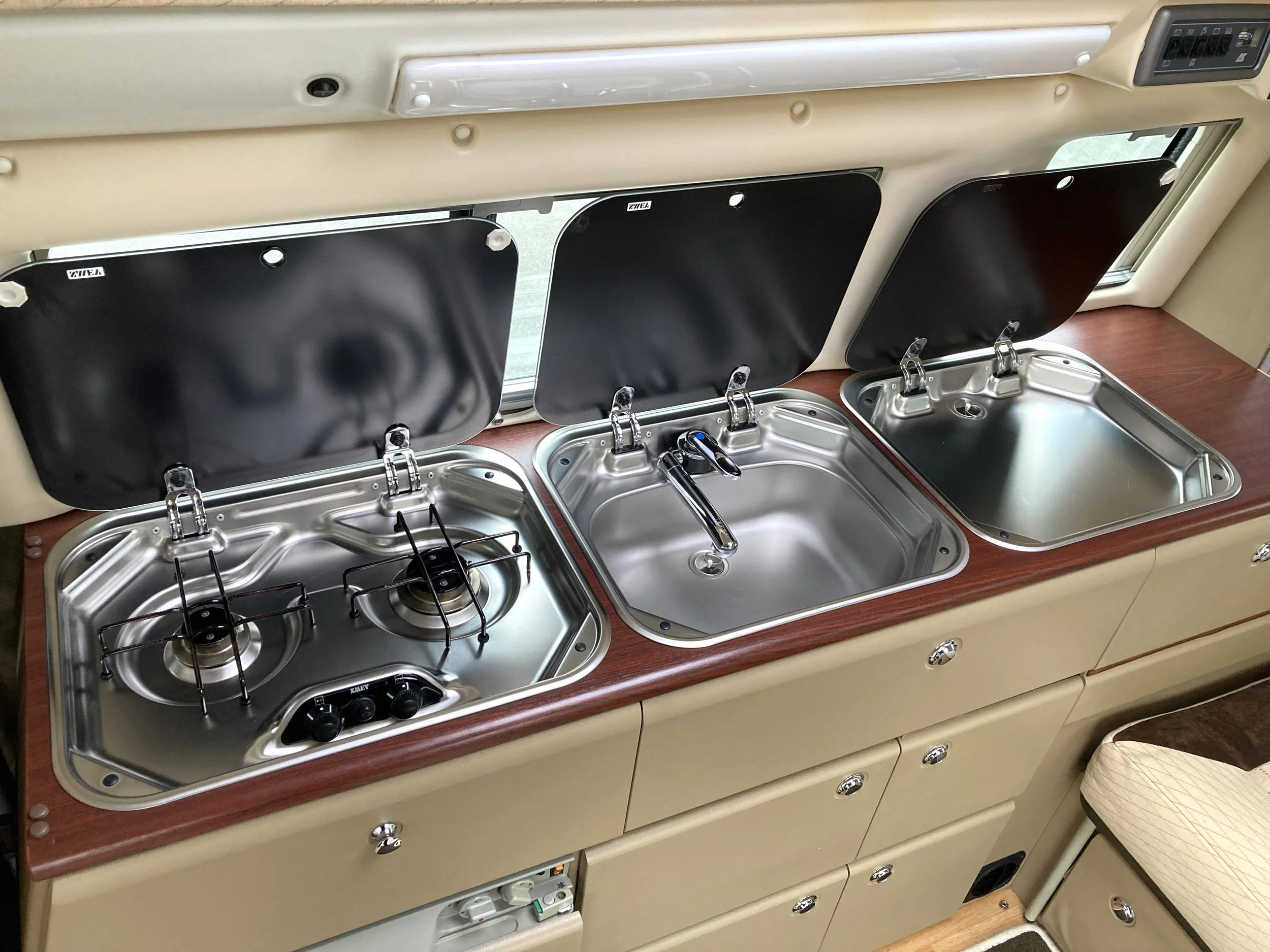 The well-planned interior also includes a functional kitchen area with storage and workspace, making cooking on the road simple and convenient.