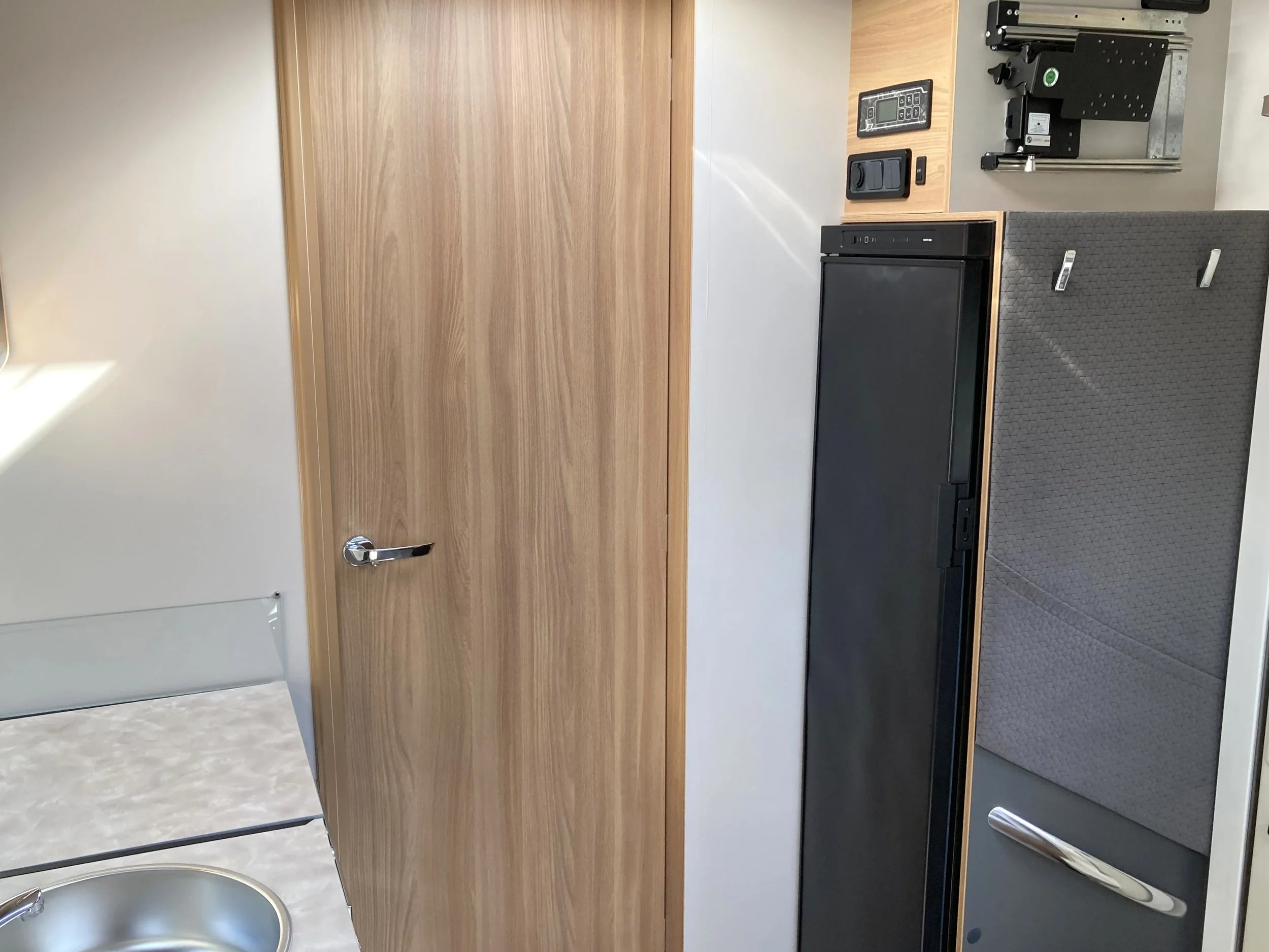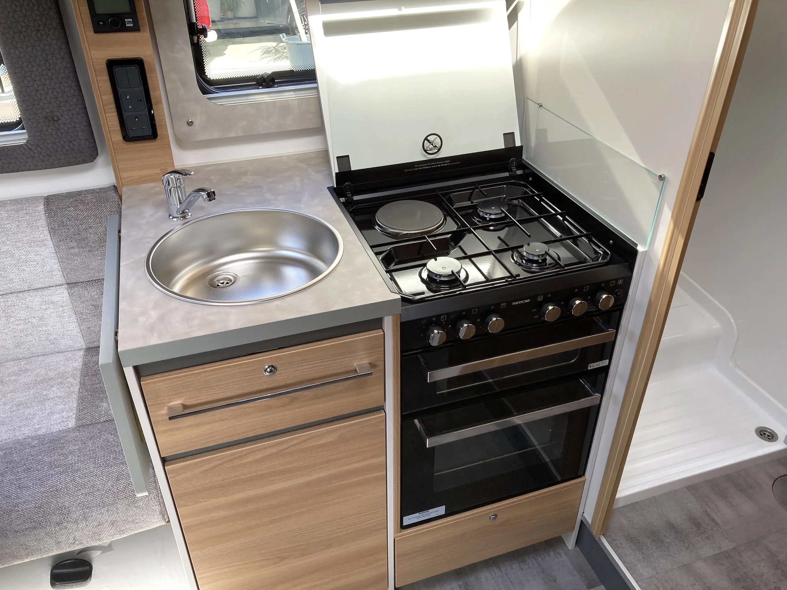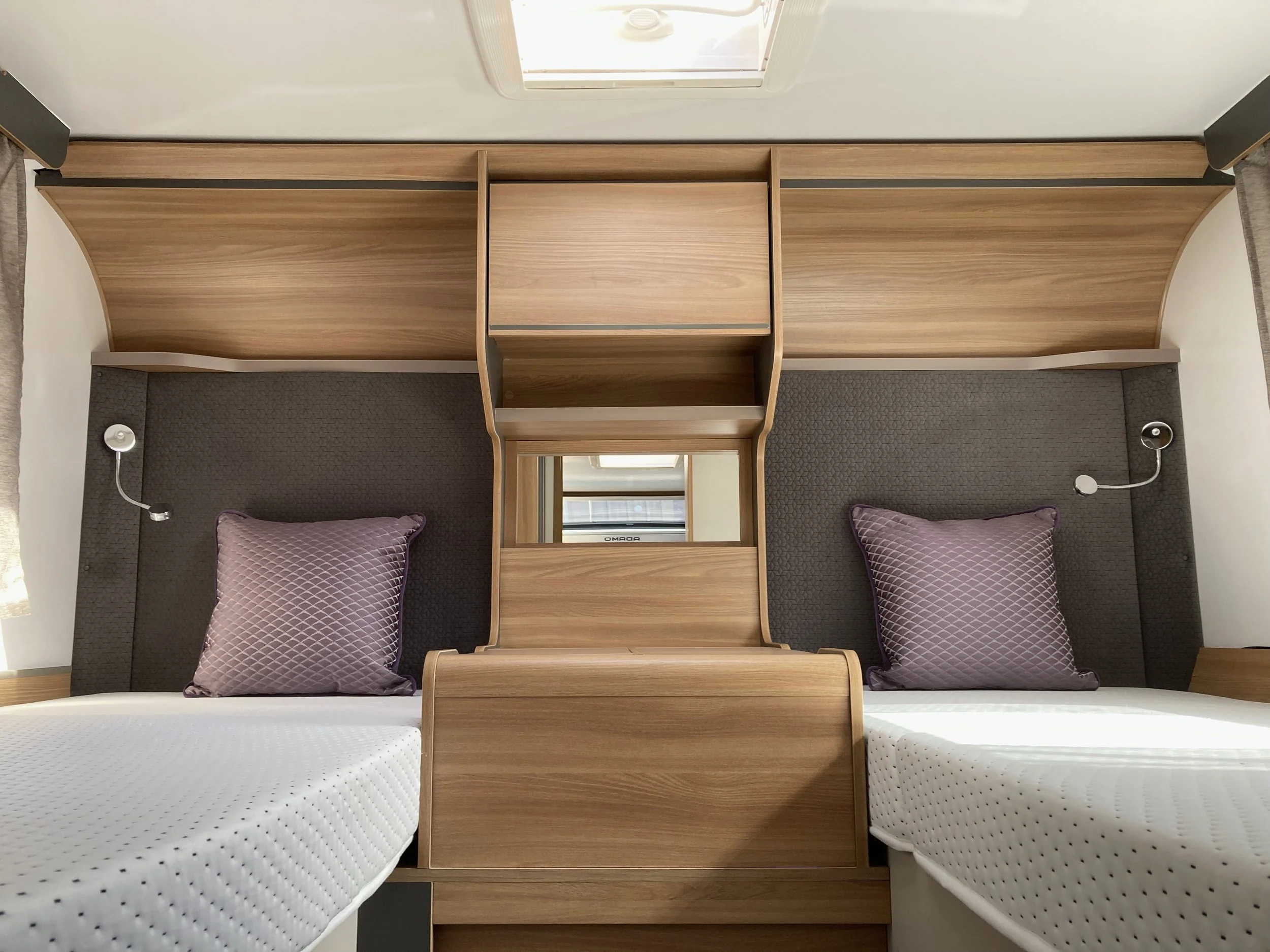 At the rear, the fixed island bed offers easy access from both sides, along with wardrobes and overhead storage. A closing door provides added privacy, making it ideal for couples seeking comfort and convenience on longer trips.