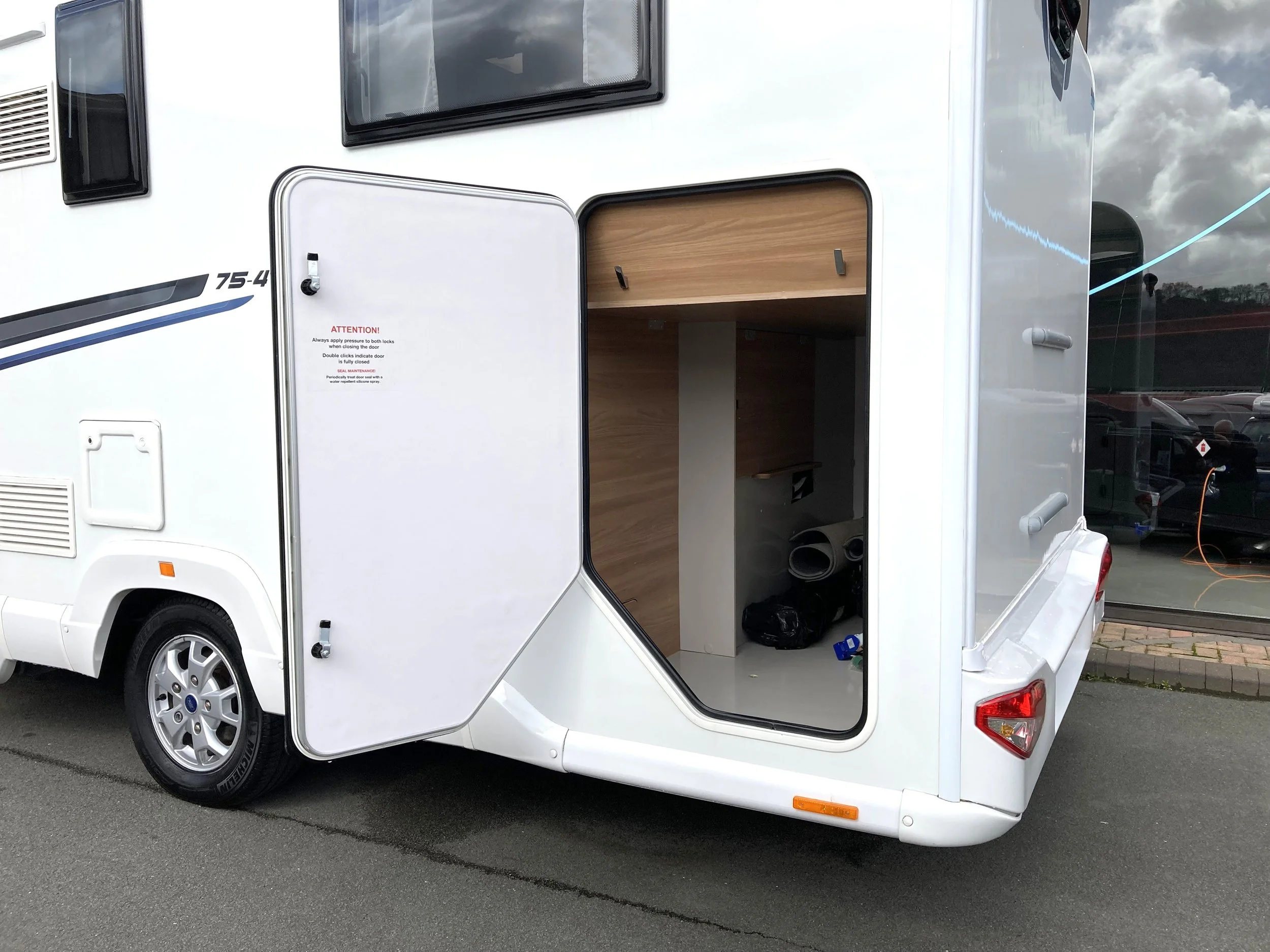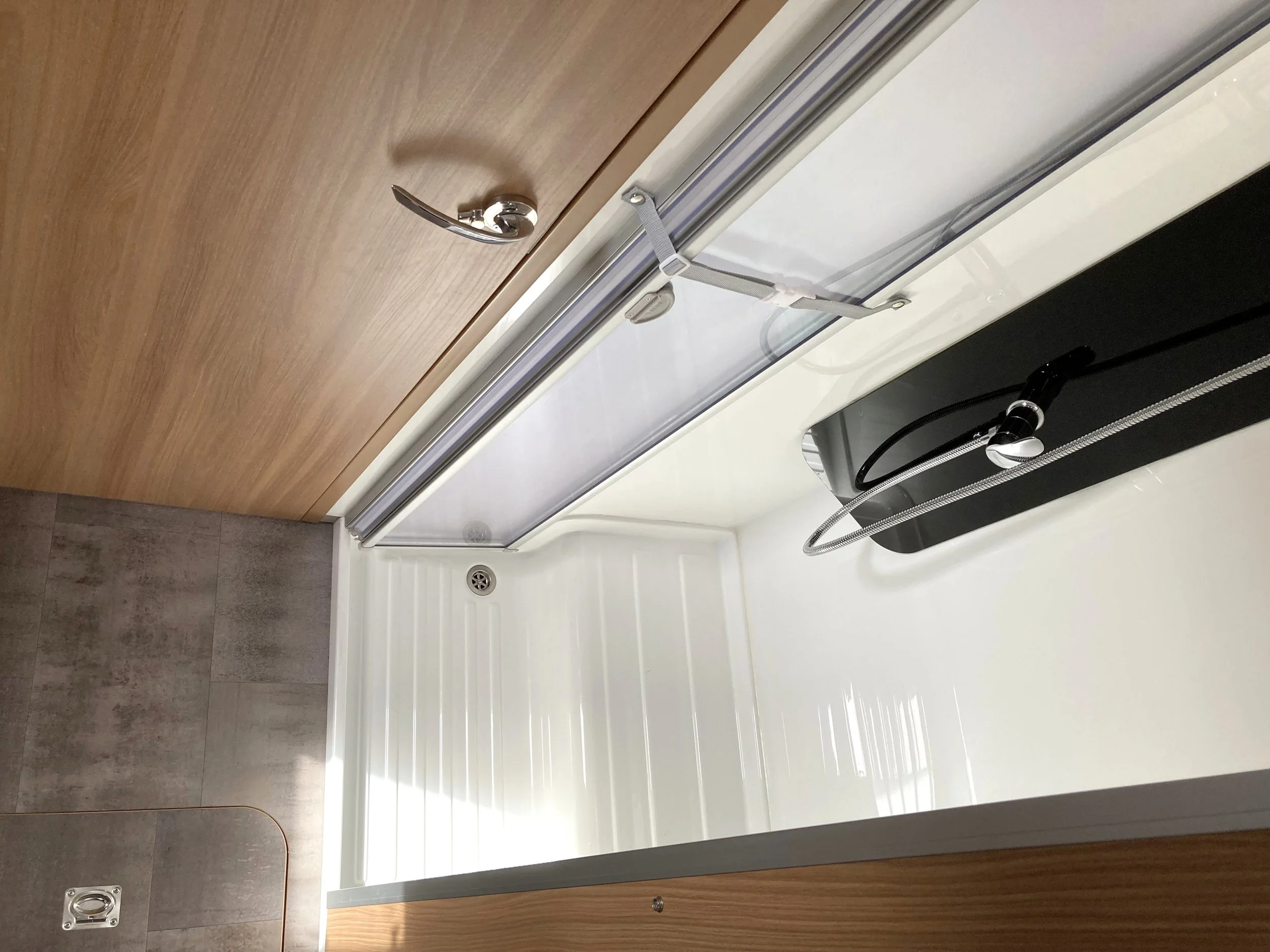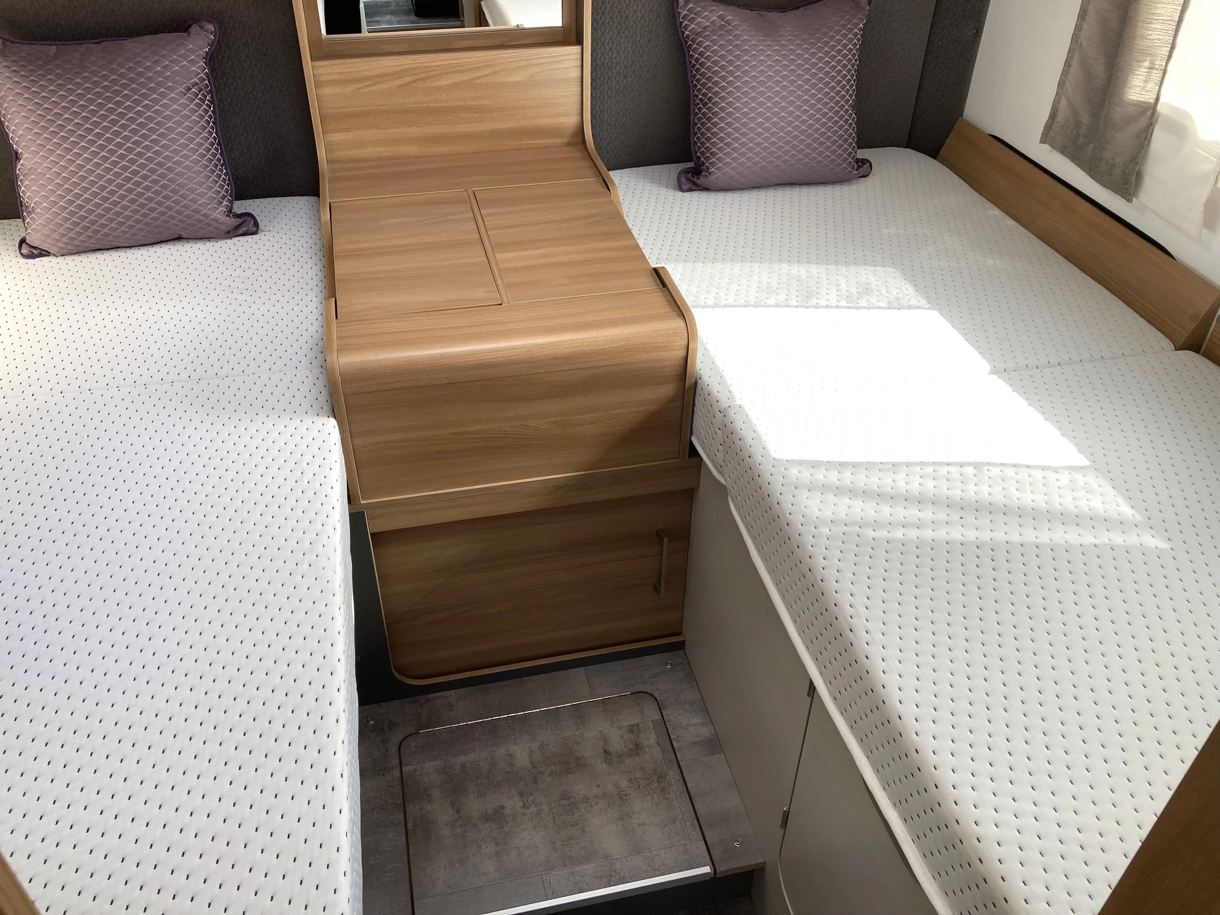 At the rear, the fixed island bed offers easy access from both sides, along with wardrobes and overhead storage. A closing door provides added privacy, making it ideal for couples seeking comfort and convenience on longer trips.