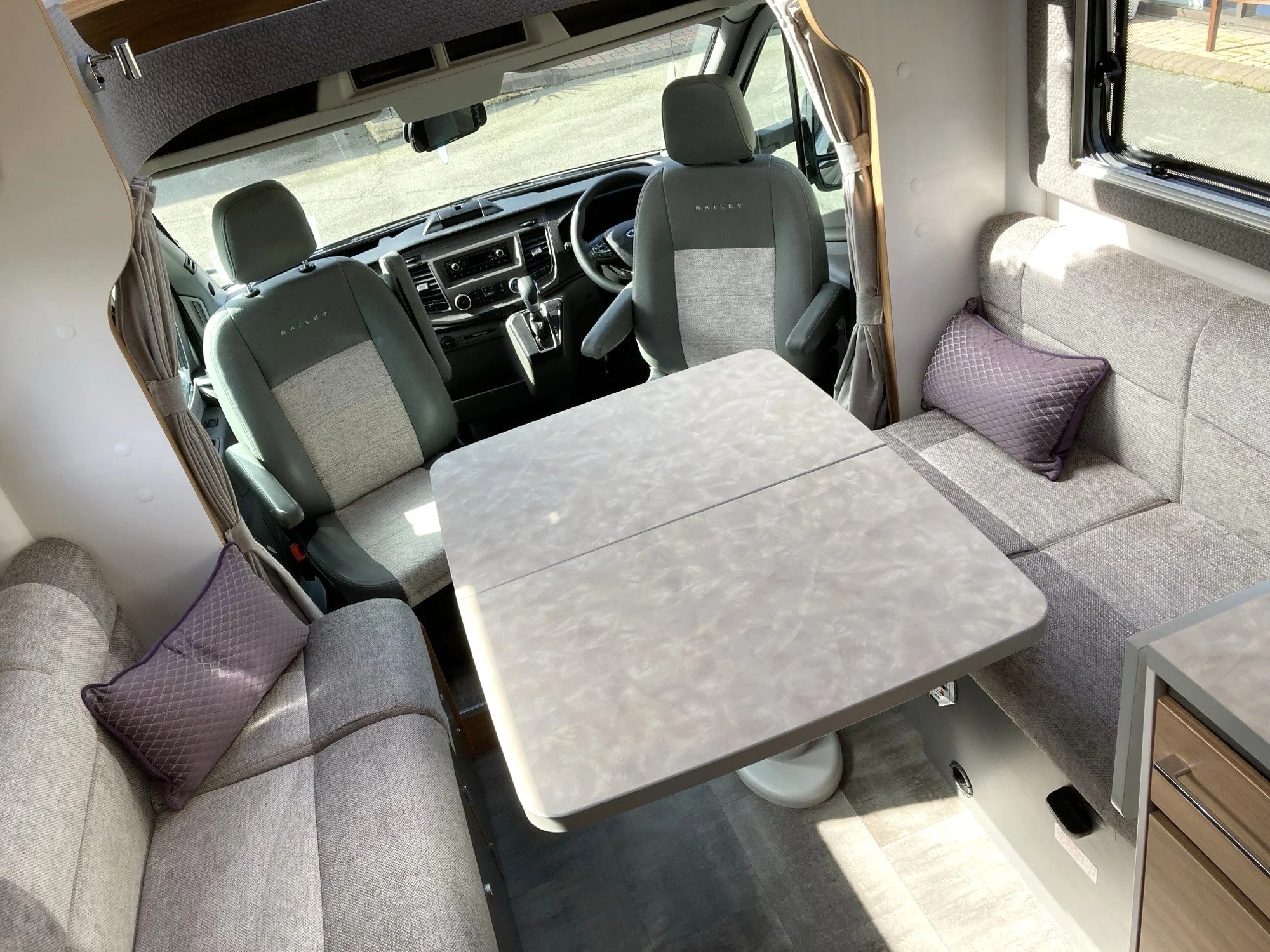 The 2024 Bailey Autograph 79-4T is a spacious four-berth motorhome with a well-balanced, practical layout. At the front, a bright lounge features parallel bench seats and swivelling cab chairs, creating a comfortable social area that converts into either two single beds or a large double.