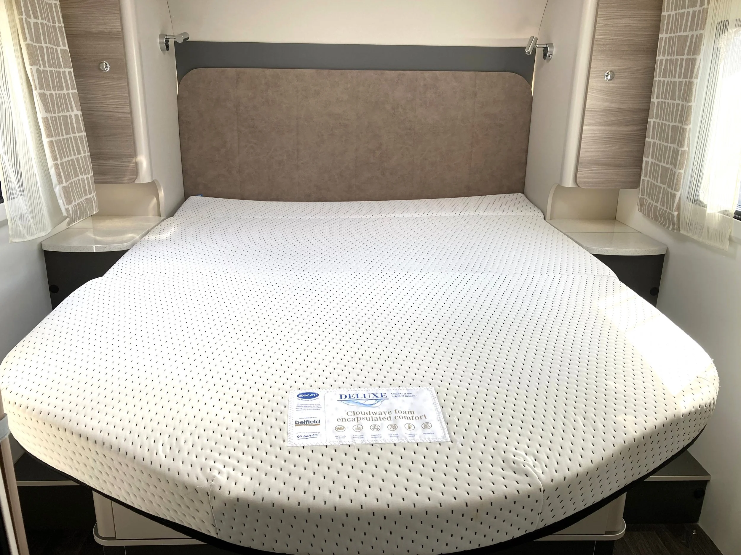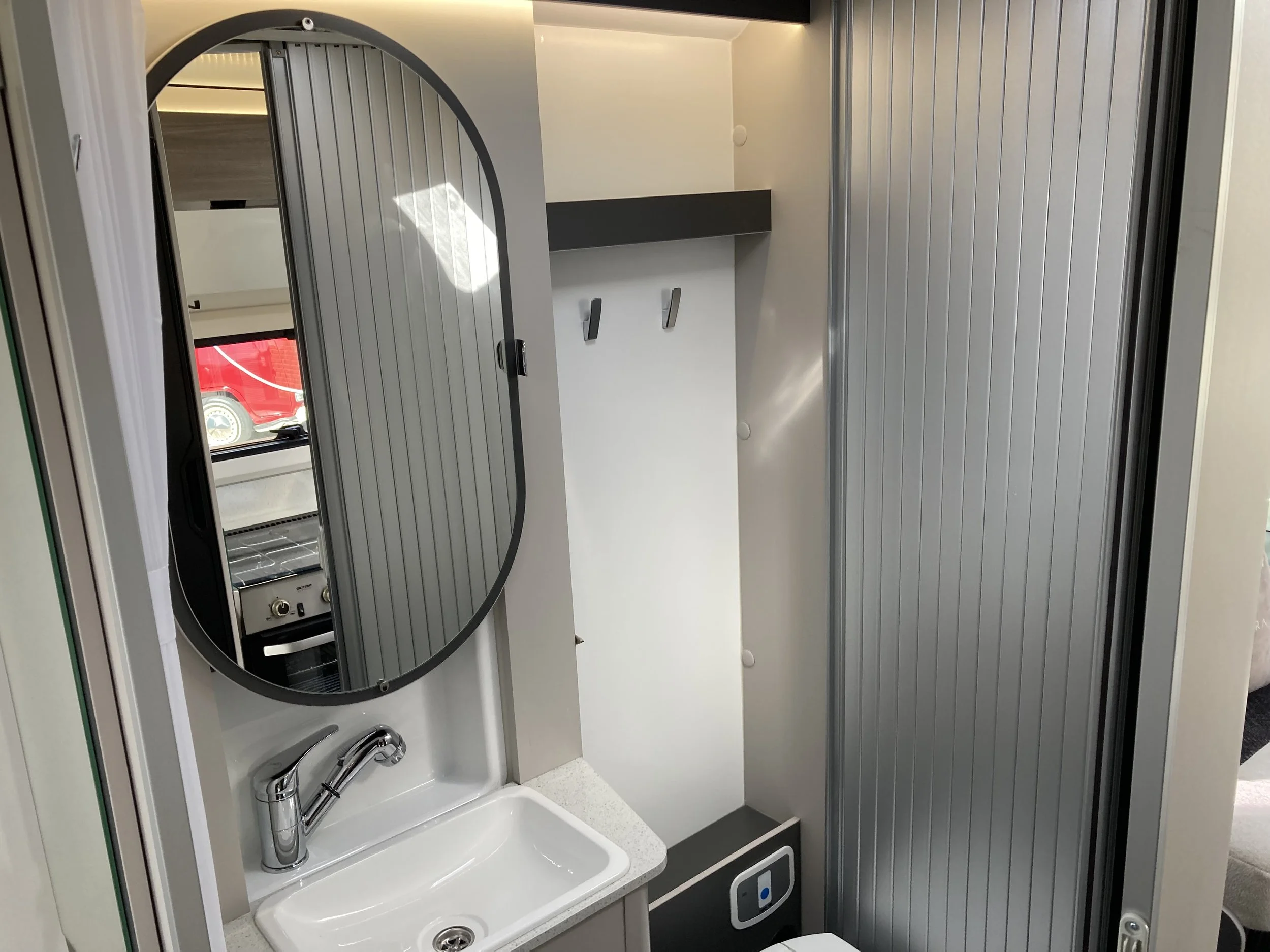 Moving through the vehicle, the well-appointed kitchen and fully equipped washroom are centrally positioned, offering practicality and convenience on the road. To the rear, a comfortable island bed provides a relaxing sleeping area with easy access from both sides, along with generous exterior storage accessible from either side of the motorhome.