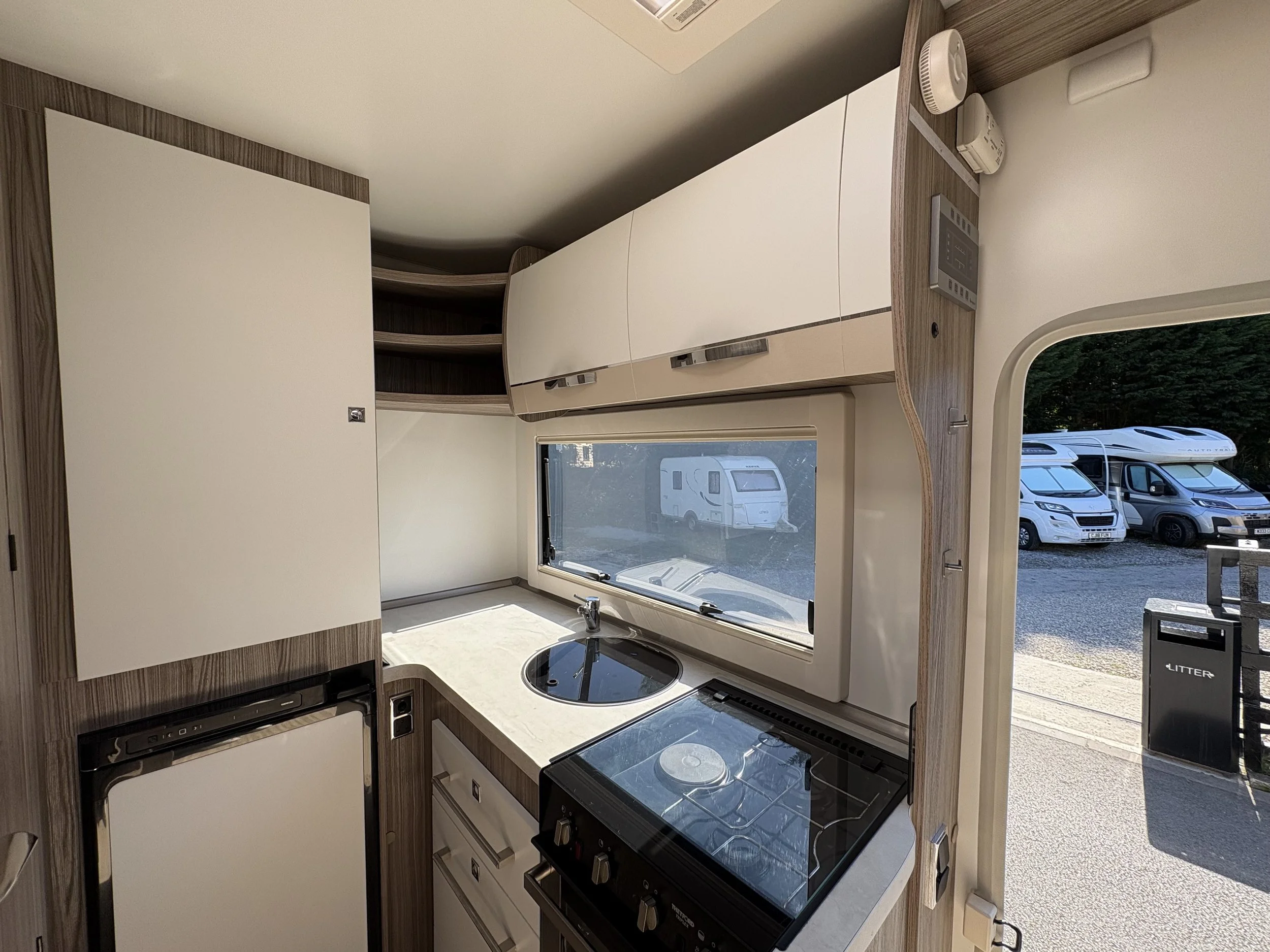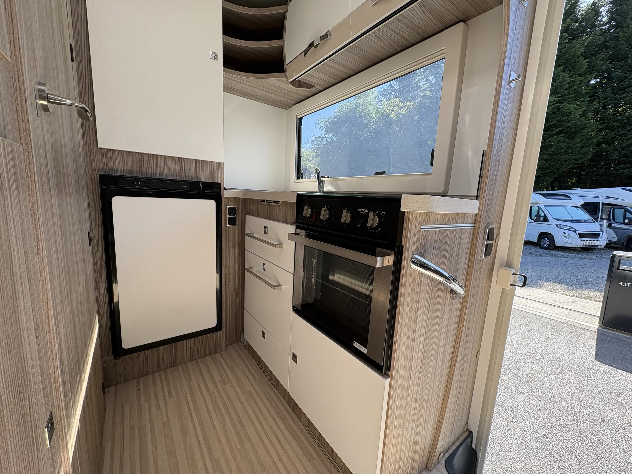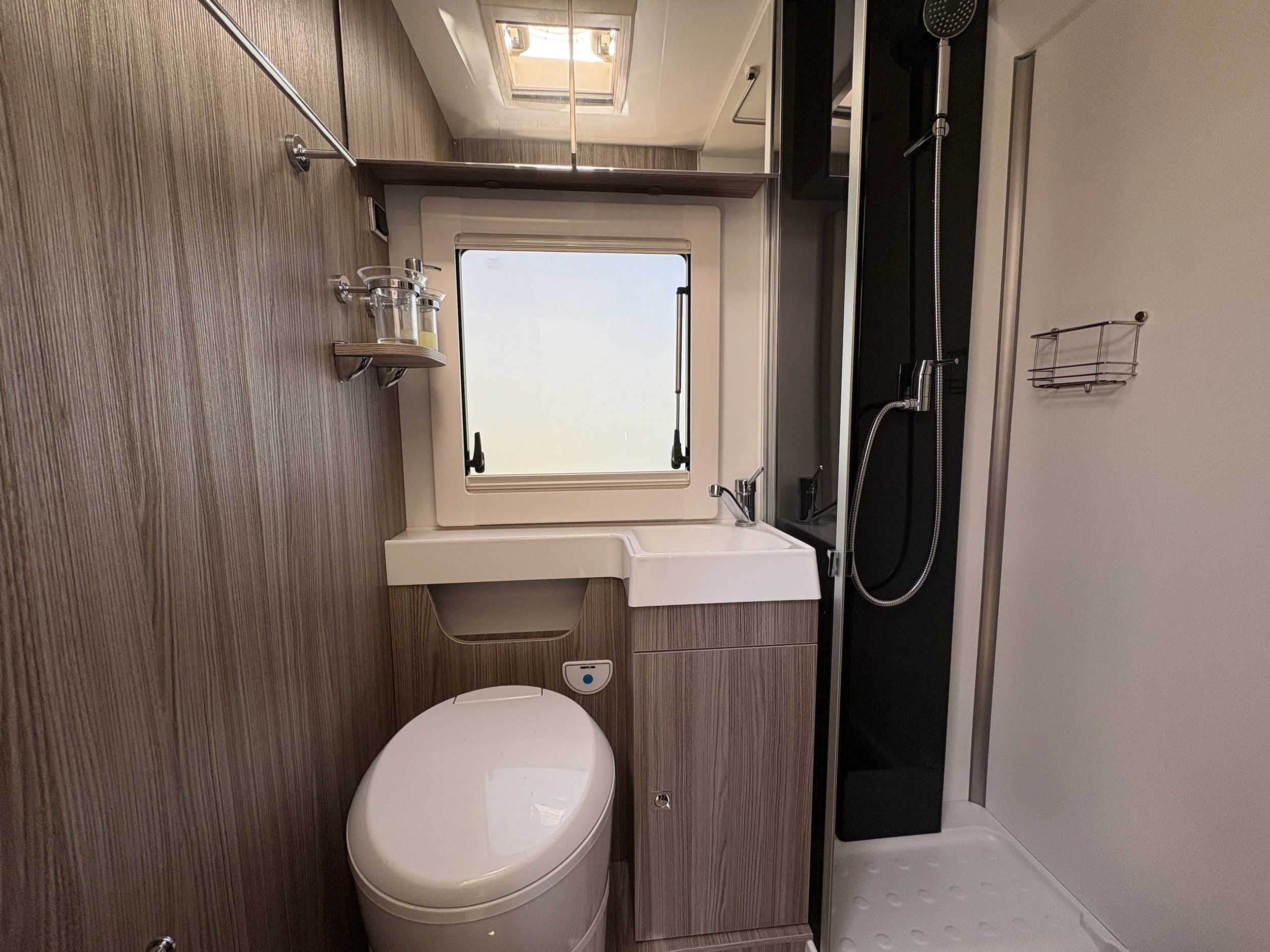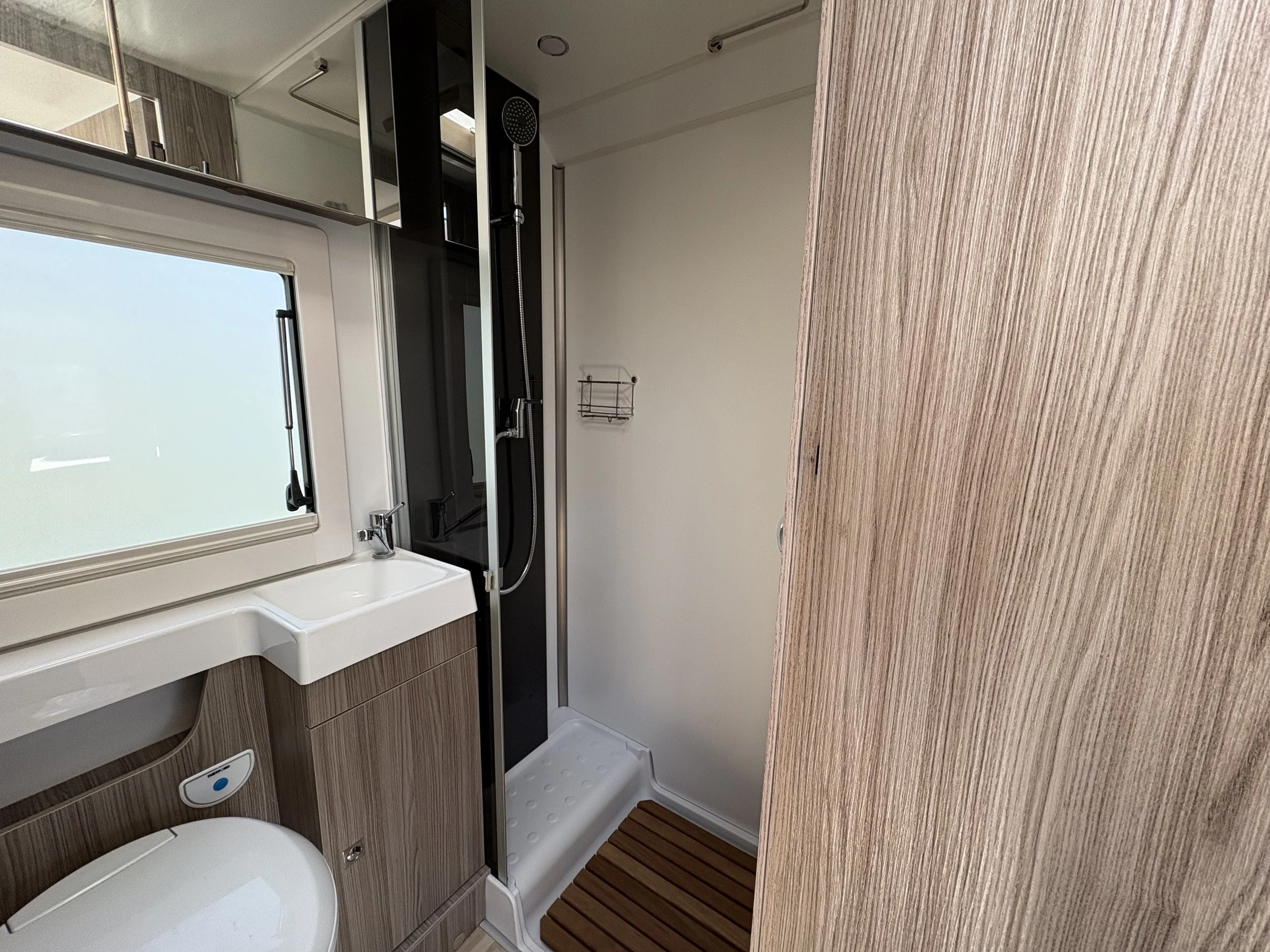 The well-designed kitchen offers generous worktop space along with a hob, oven, grill and ample storage, making it ideal for cooking on the go. To the rear, the washroom is a real highlight, featuring a separate shower cubicle—something not always found in motorhomes of this size—adding to the overall sense of practicality and comfort.