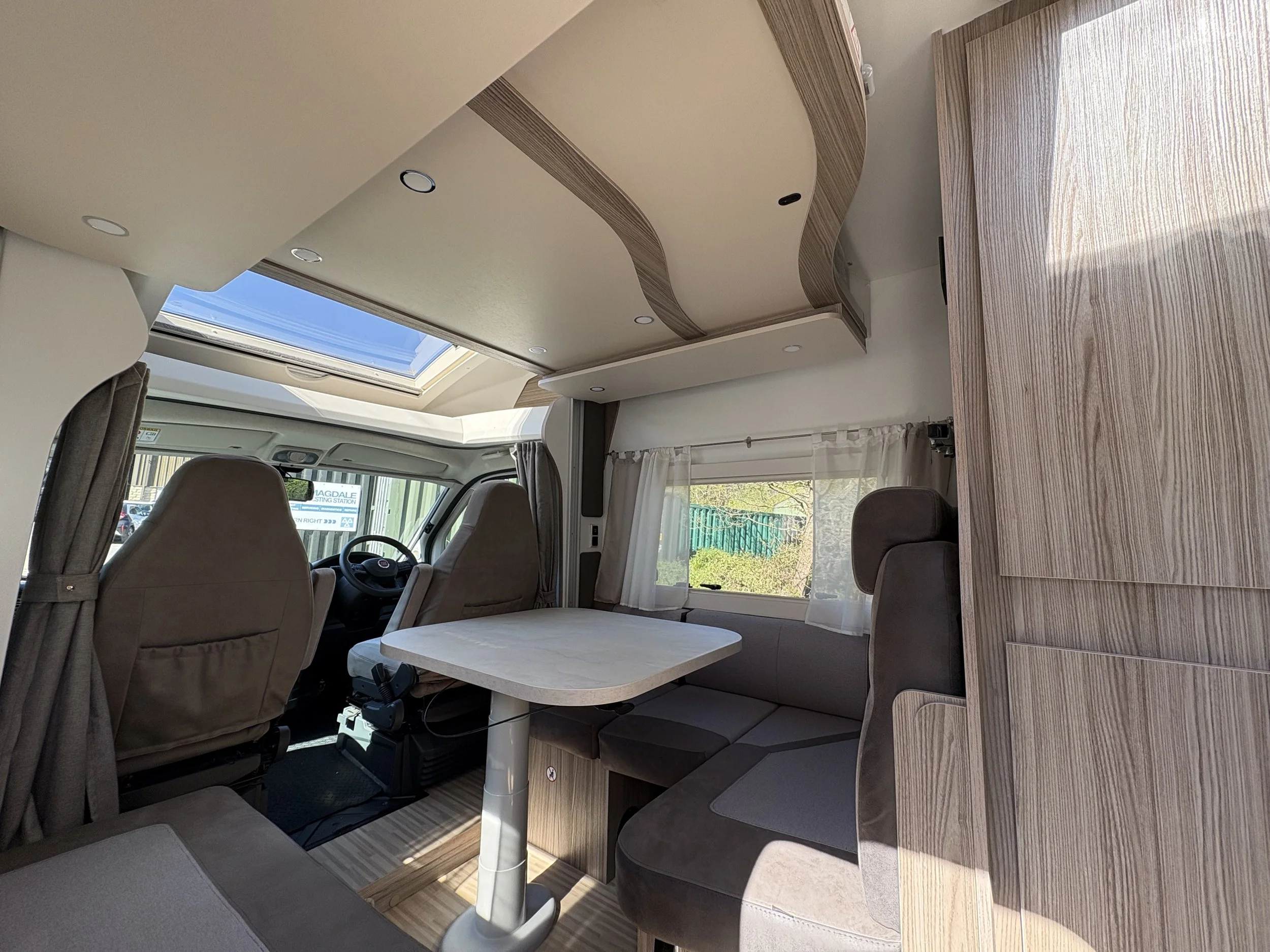 Inside, the Primero 202 features a bright and airy front lounge, enhanced by a large skylight and well-positioned windows that flood the space with natural light. The lounge comfortably seats multiple people and easily converts into a second double bed, while an electrically operated drop-down bed above provides a convenient and comfortable main sleeping area.