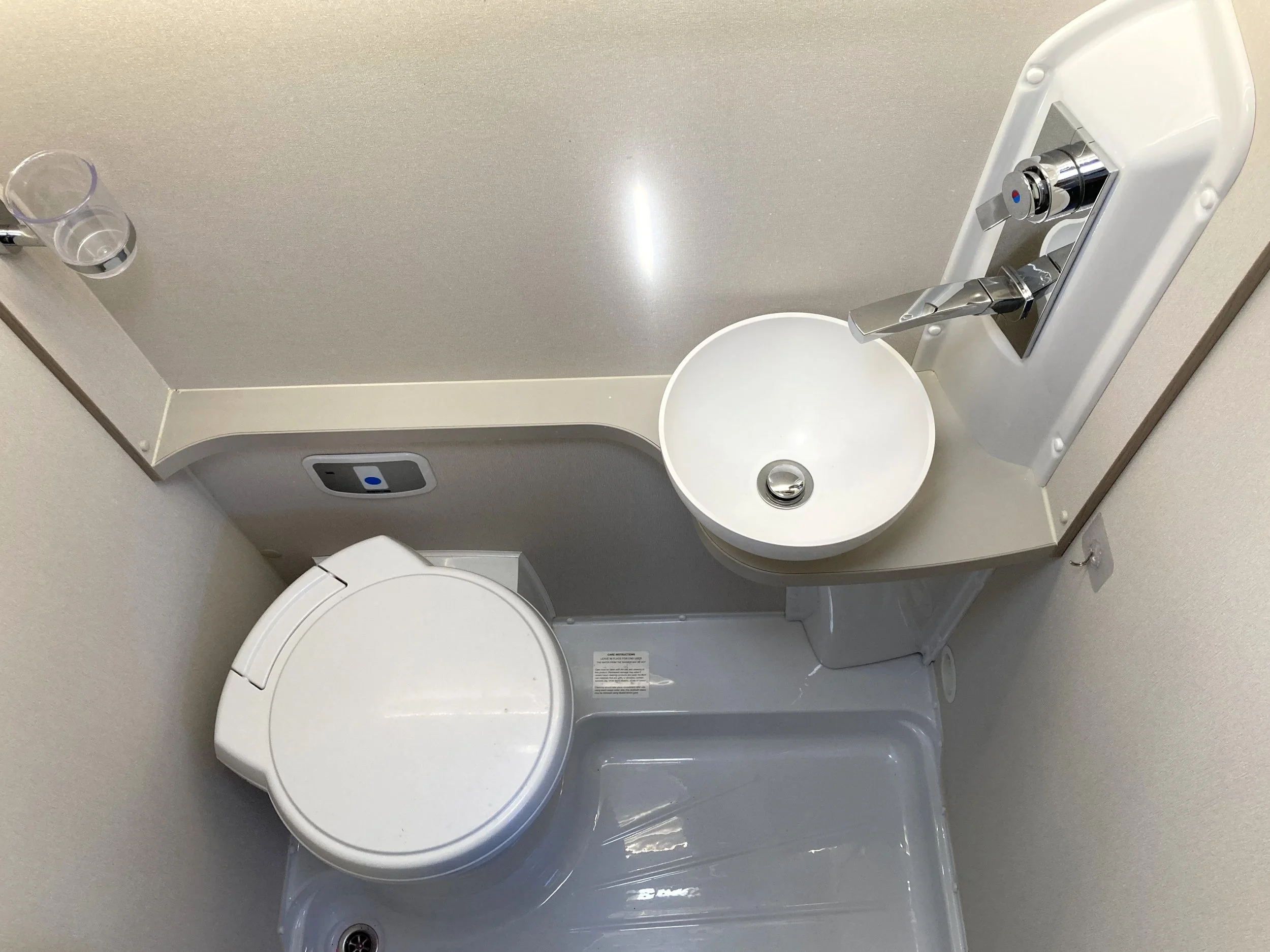 The central kitchen is well-positioned and fully equipped, making meal preparation simple while on the move. Opposite, the compact washroom includes a shower, toilet, and washbasin, providing everything you need in a convenient space.