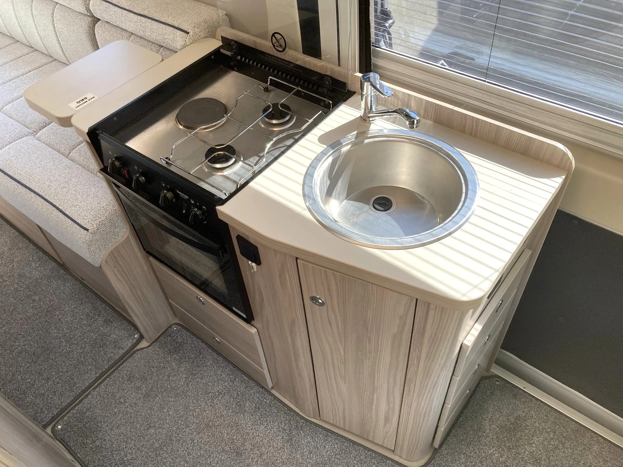 The Elddis Autoquest CV20 Chatsworth features a smart and versatile layout designed for comfort and practicality. At the rear, two long bench seats create a spacious lounge area, perfect for relaxing during the day—especially with the rear doors open to bring the outside in. This area easily converts into either two single beds or a large double, offering flexible sleeping arrangements.