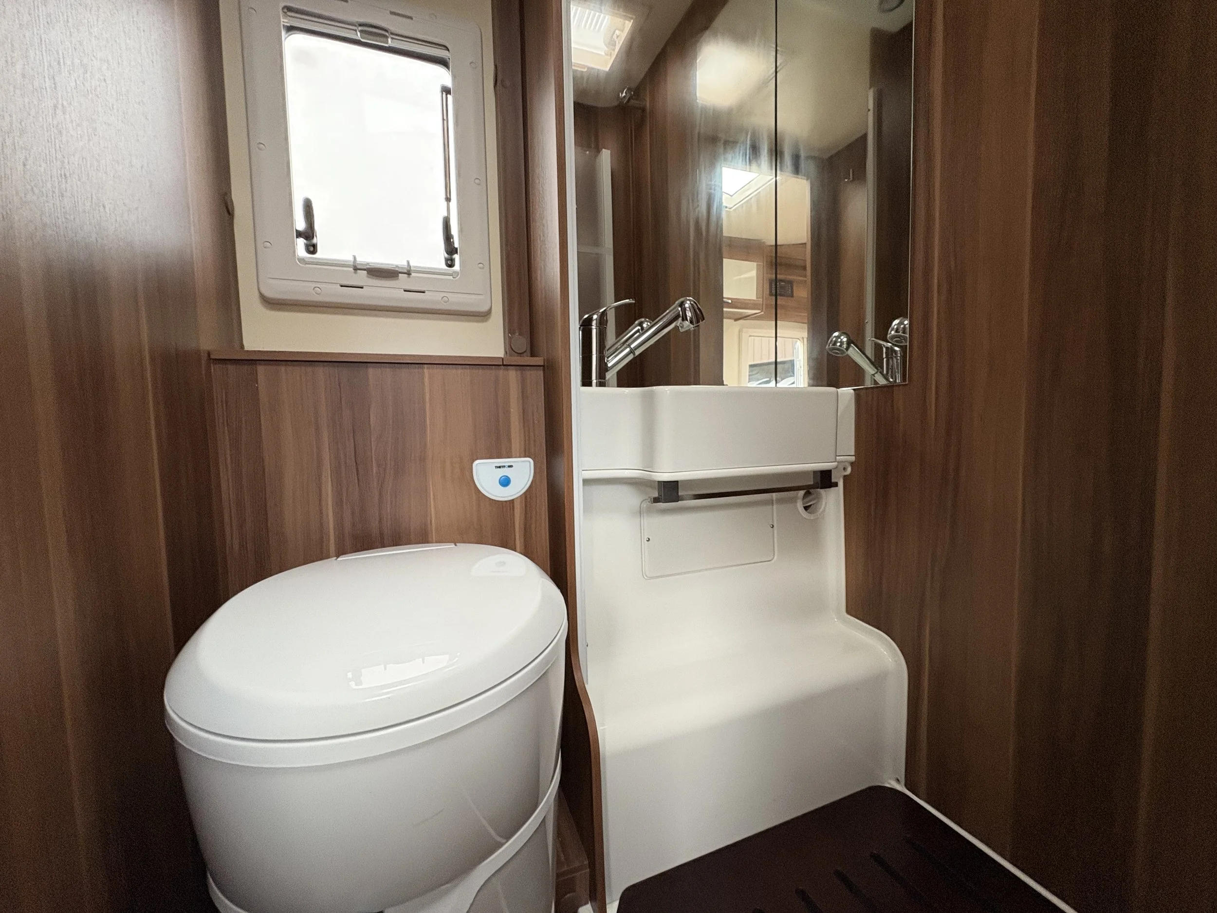 The well-equipped central washroom includes a shower, cassette toilet, and a modern sink/vanity unit for added convenience on the road.