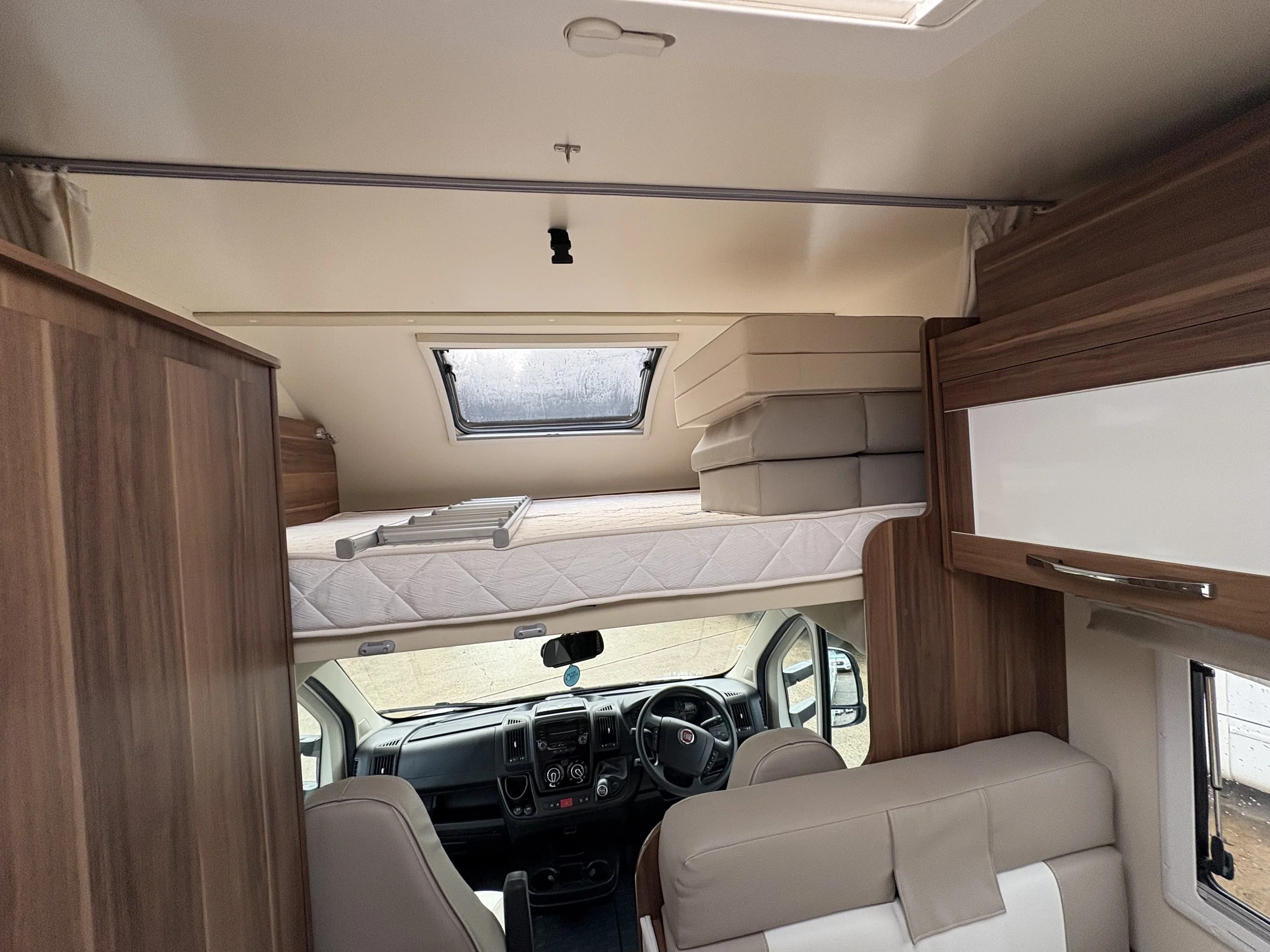 At the front, you’ll find a practical dinette area with two designated travelling seatbelts. This space also converts into a comfortable double bed, while above the cab is a double bed, offering plenty of sleeping options for everyone.