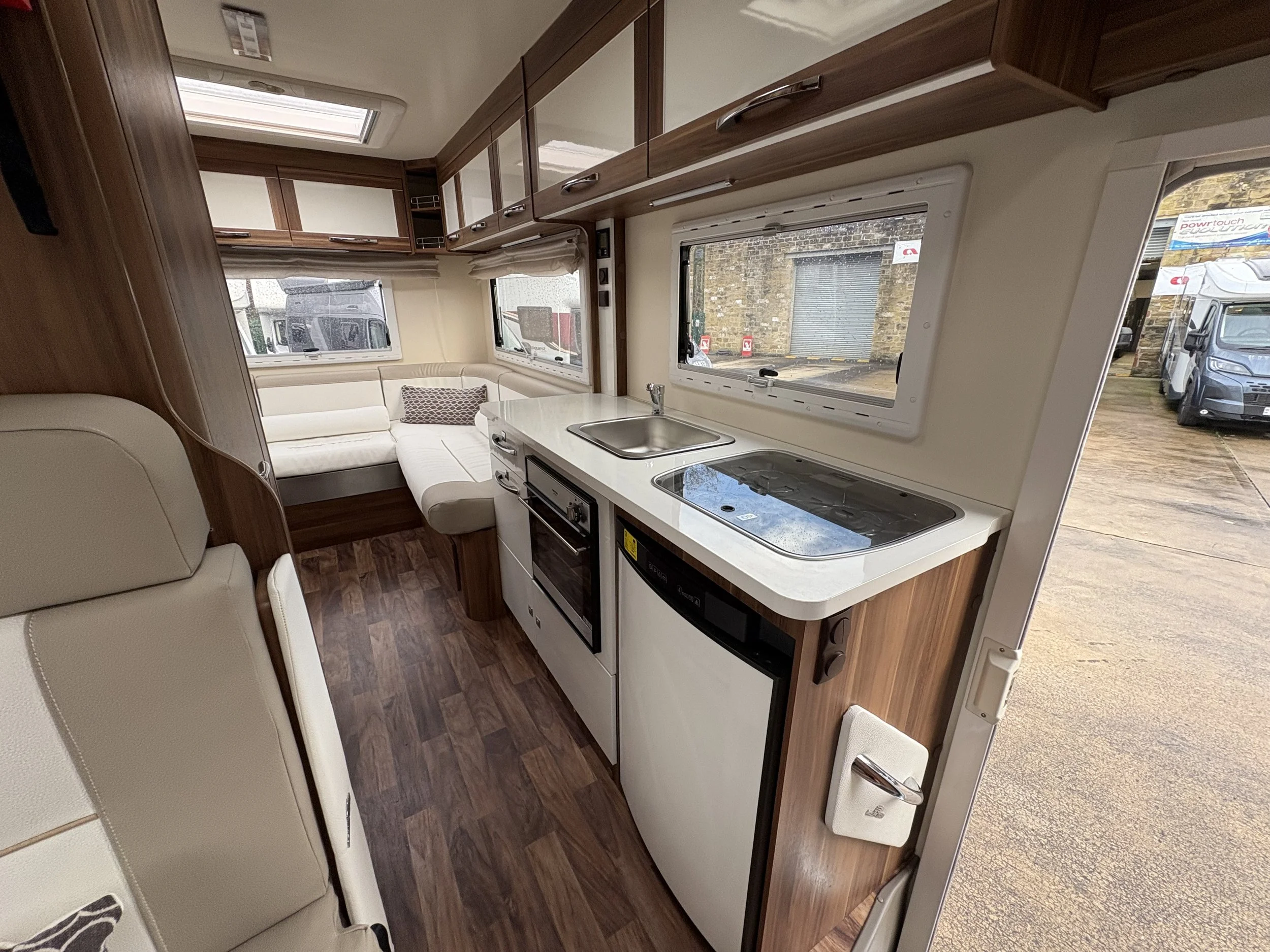 In the central kitchen, you’ll enjoy a combination cooker, fridge/freezer, and ample storage, with overhead lockers and cupboards providing space for all your essentials.
