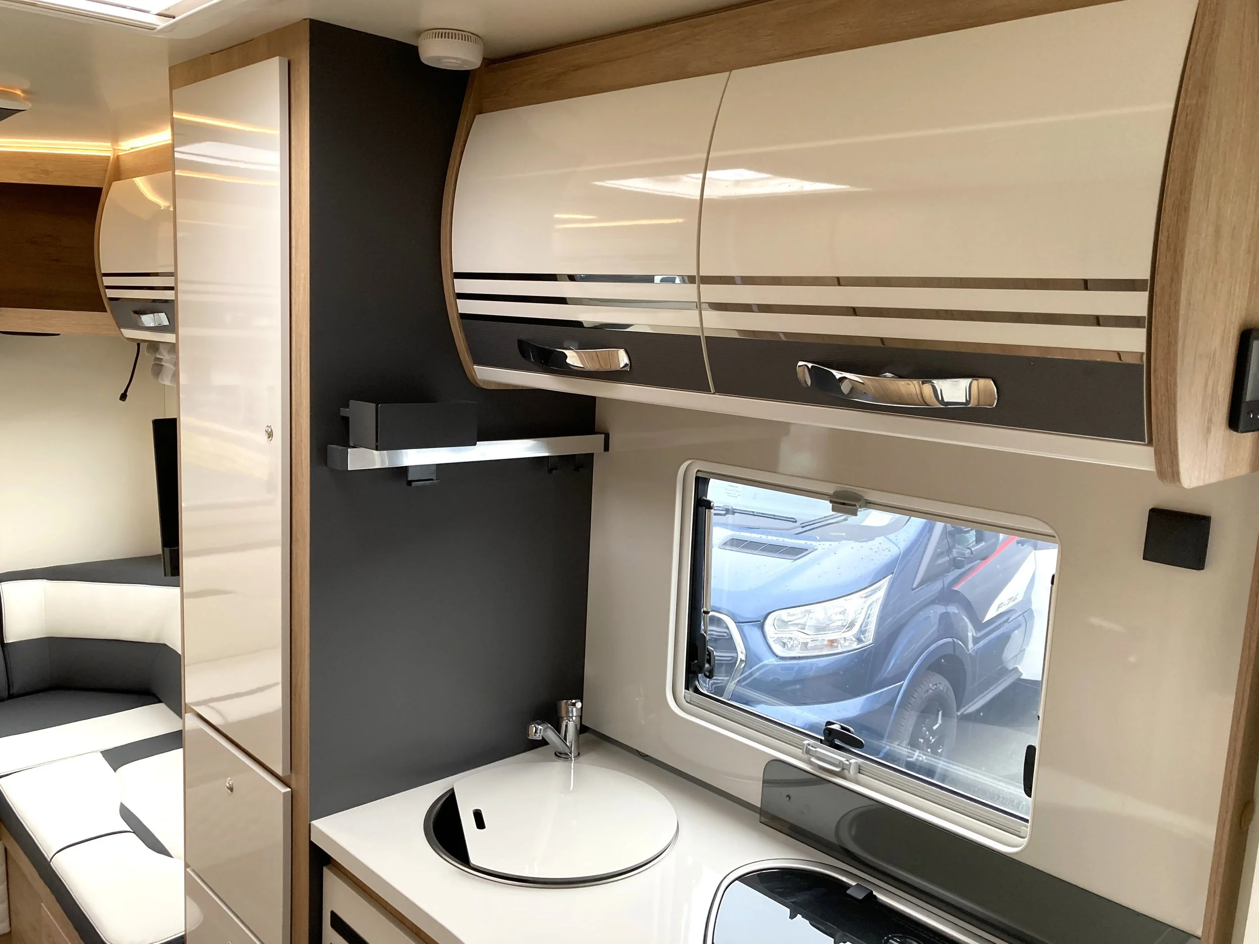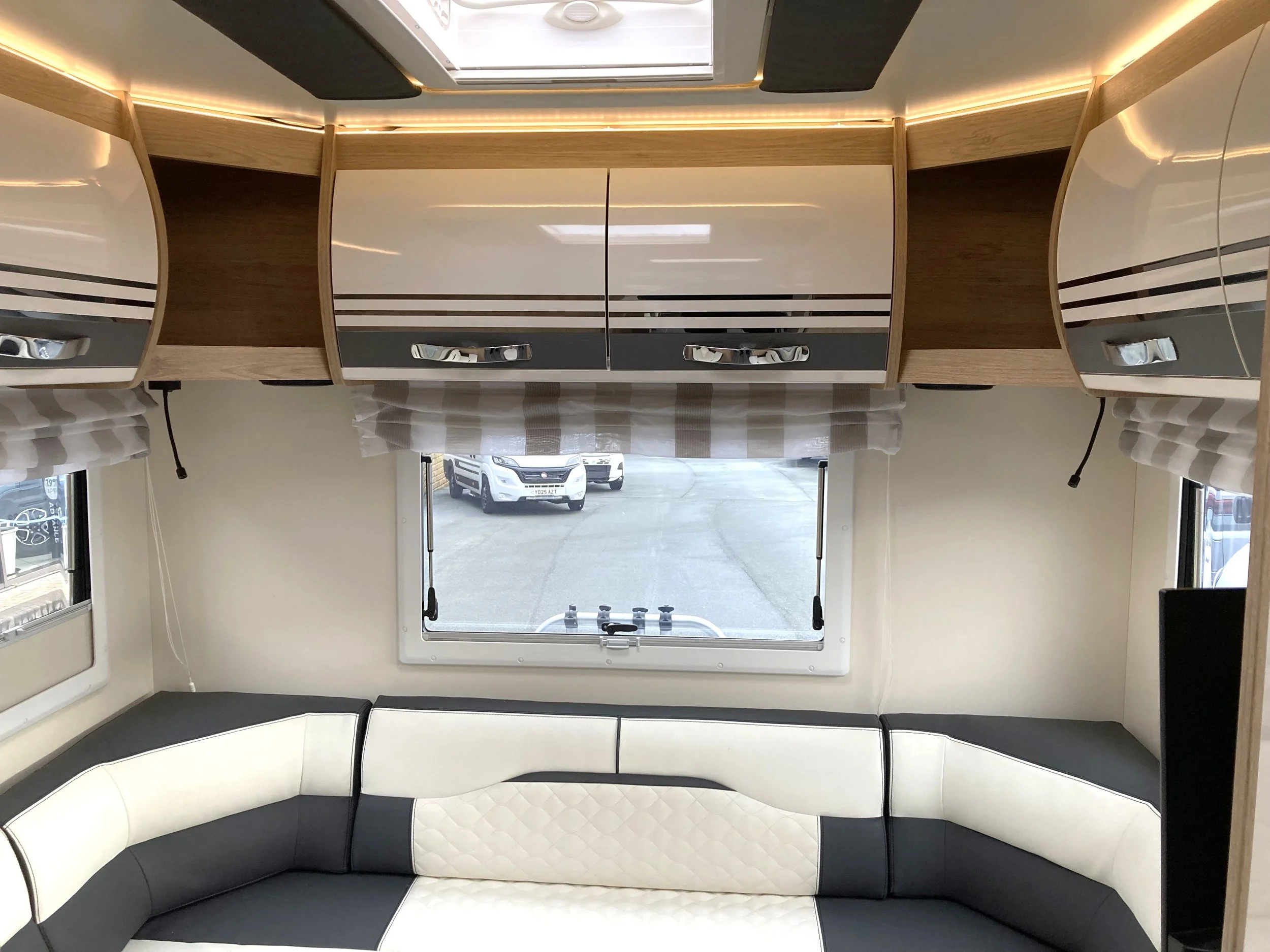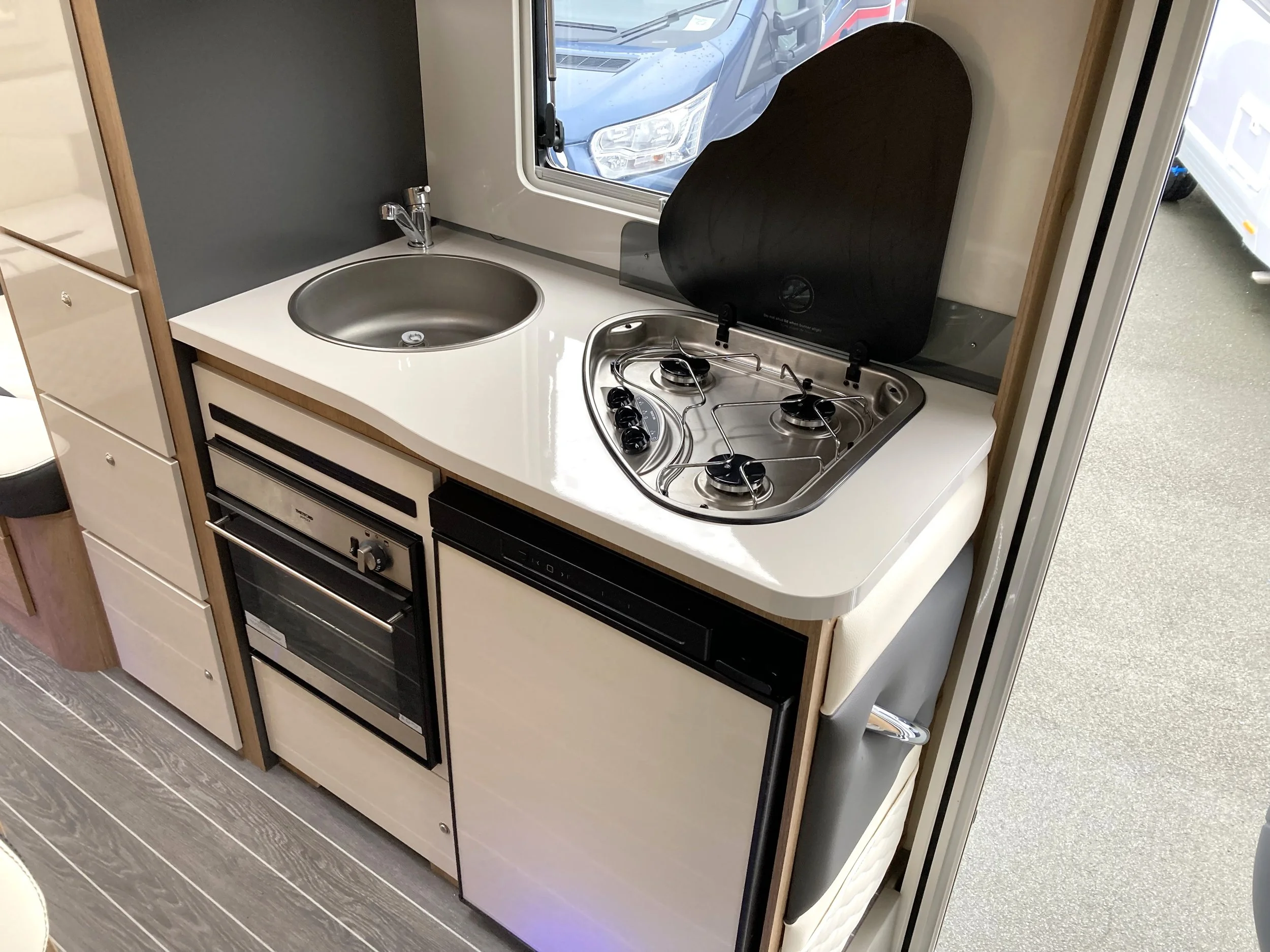 The light and airy interior includes a comfortable front dinette with an electric drop-down double bed above, a fully equipped central kitchen, a washroom opposite, and a generous rear U-shaped lounge – ideal for socialising, dining or converting into additional sleeping space. There’s also convenient external storage beneath the rear lounge, perfect for outdoor gear and essentials.