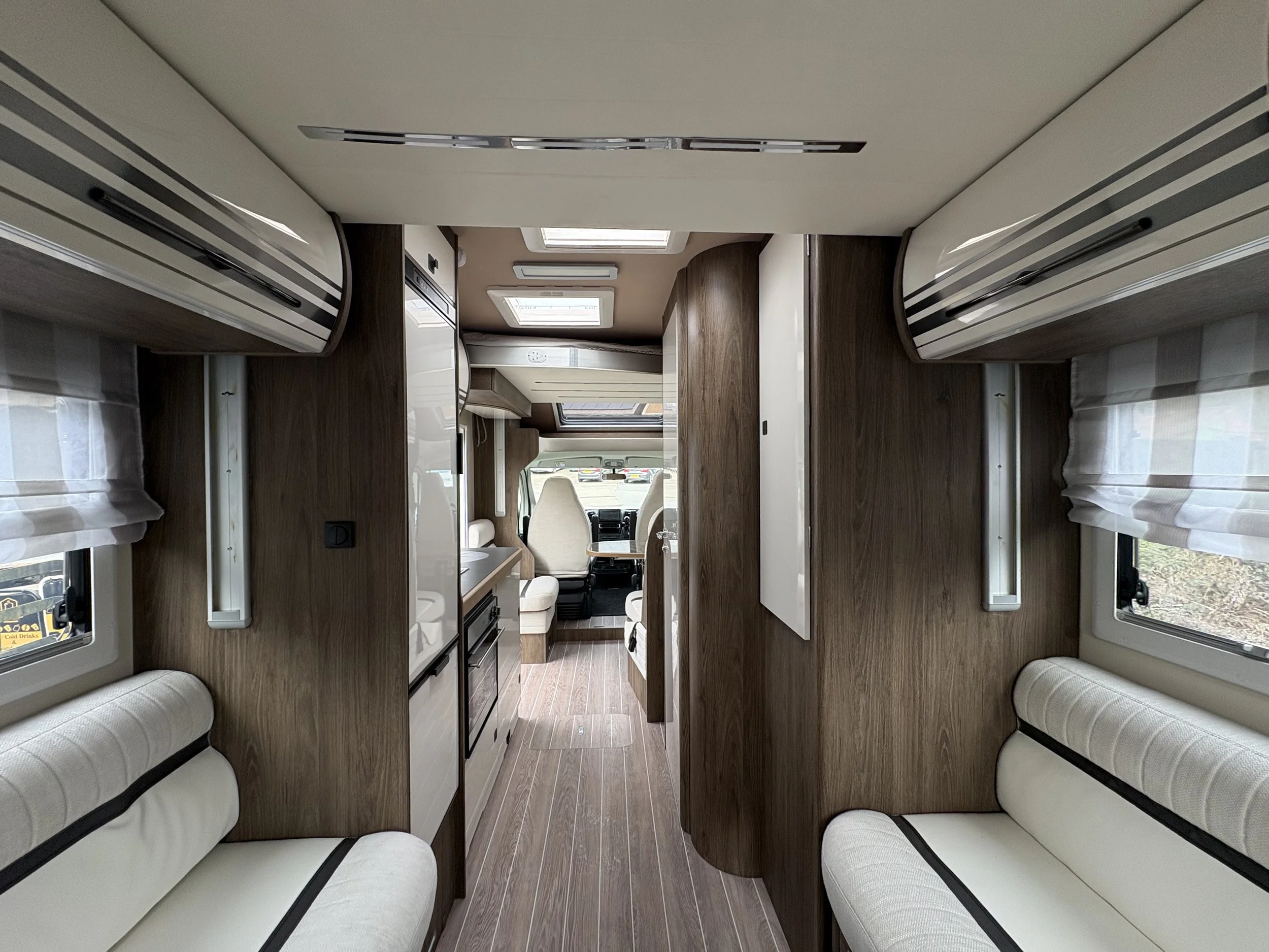 Towards the front of the motorhome is the dinette area, enhanced by swivelling cab seats to create a versatile dining and social space. Above this area, a second electric drop-down double bed provides additional sleeping accommodation, allowing the vehicle to comfortably sleep four while keeping the living areas free during the day.