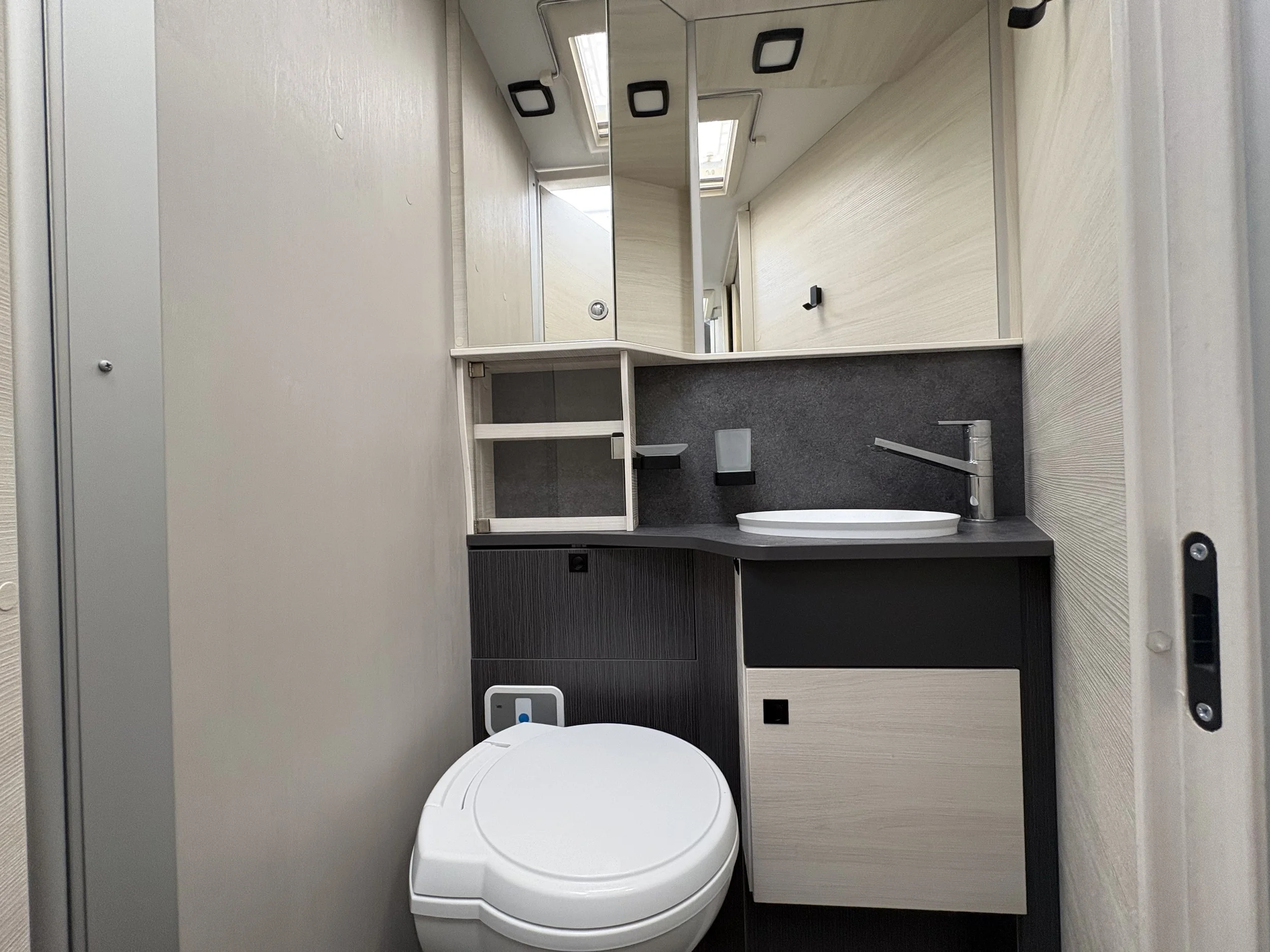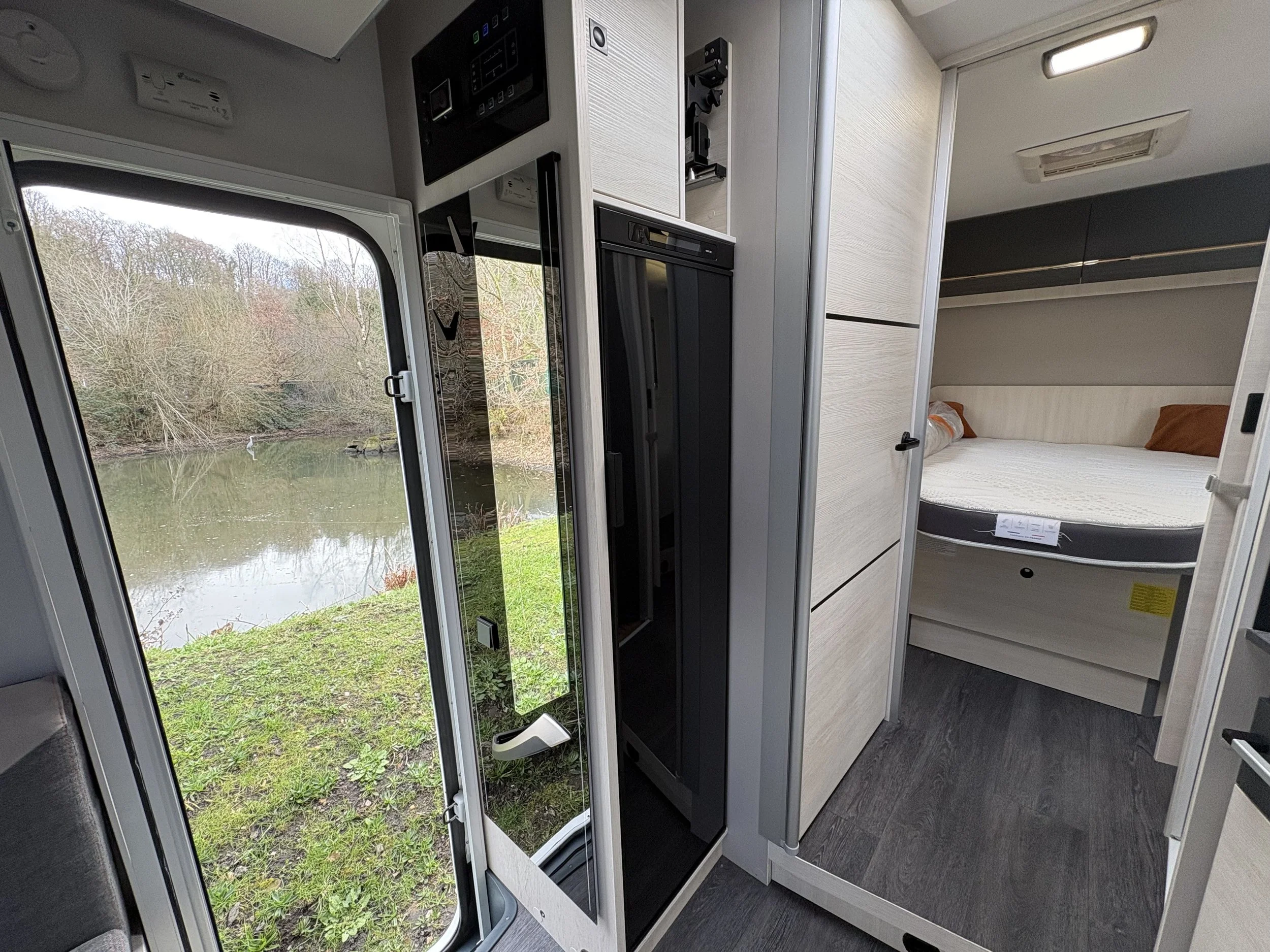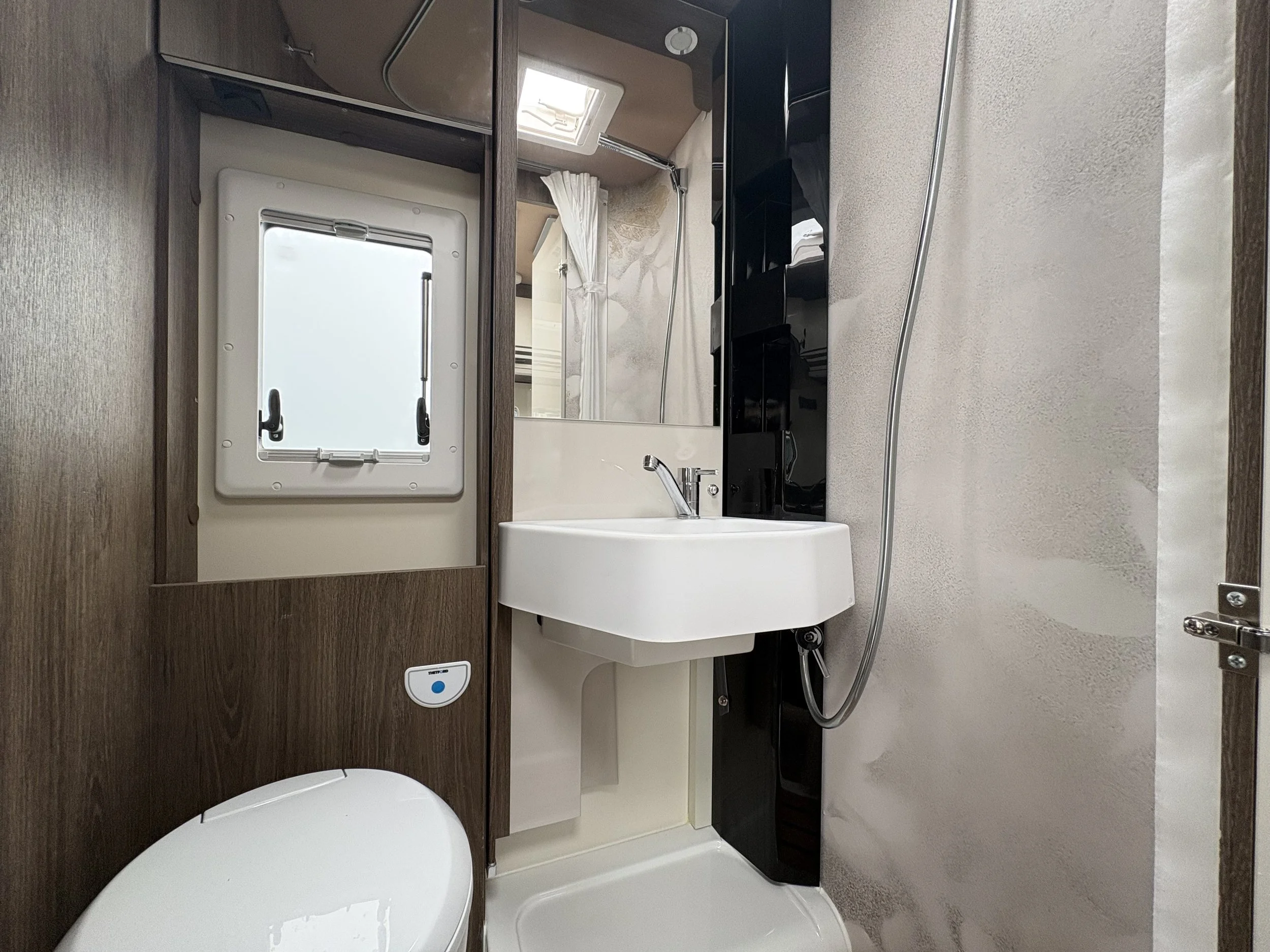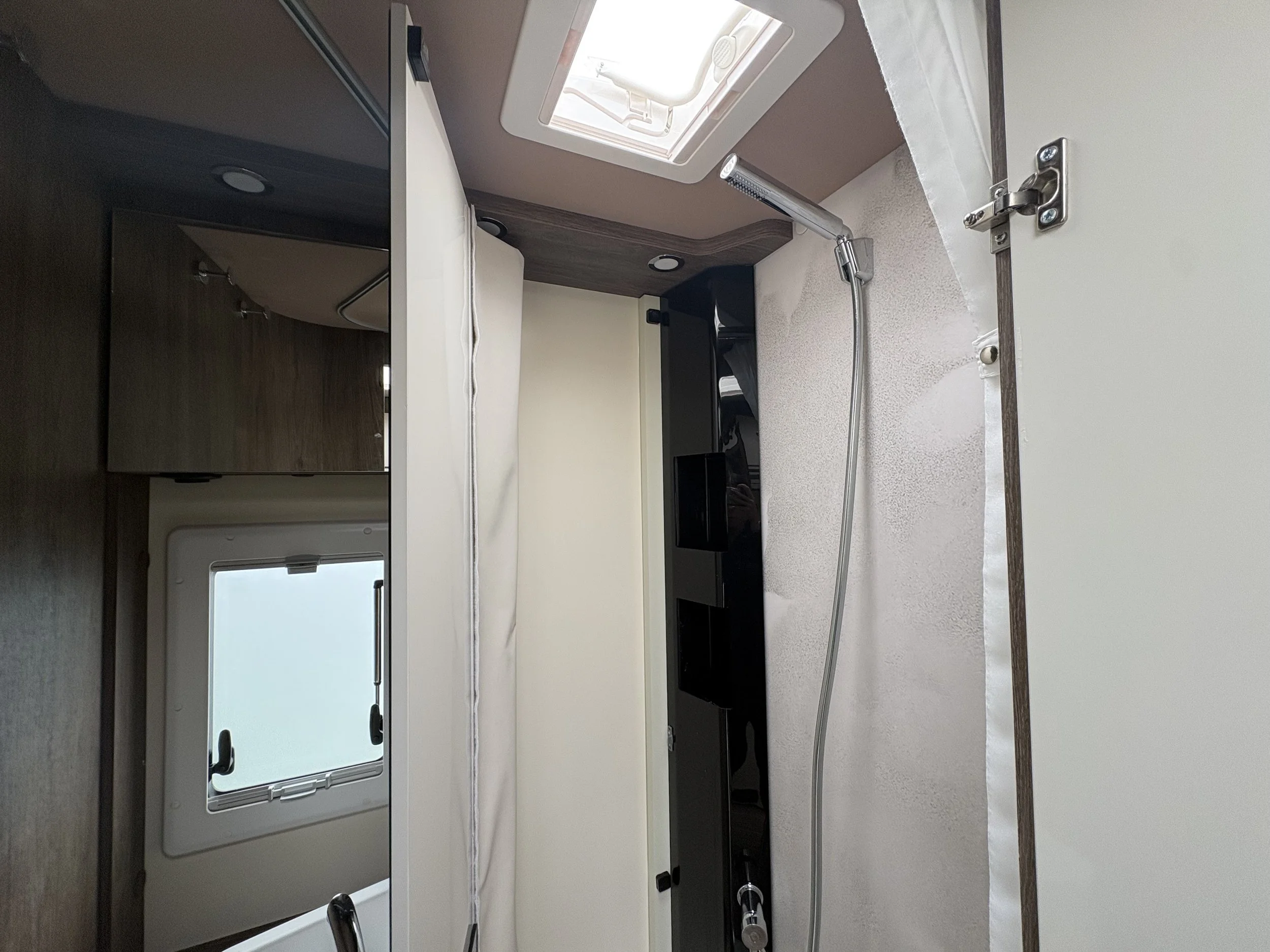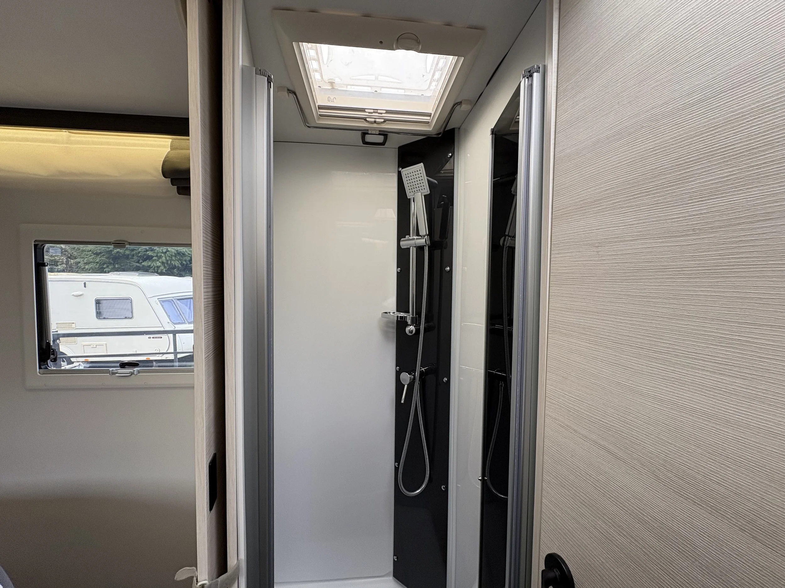 Opposite the kitchen sits the innovative central washroom, featuring a clever pivoting wall system that separates the shower and toilet areas. This adaptable design allows you to maximise space and enjoy a more comfortable, home-like bathroom experience.