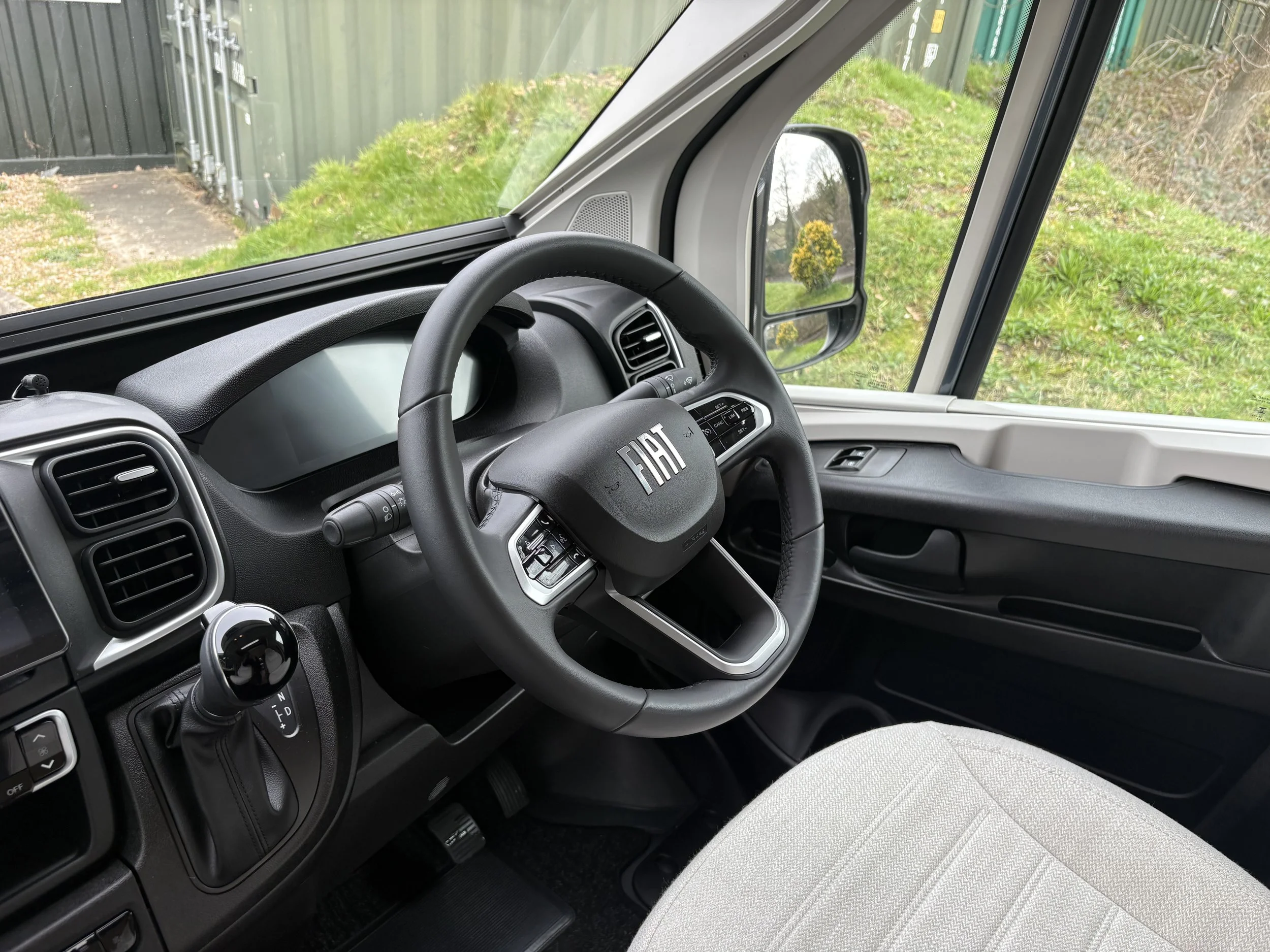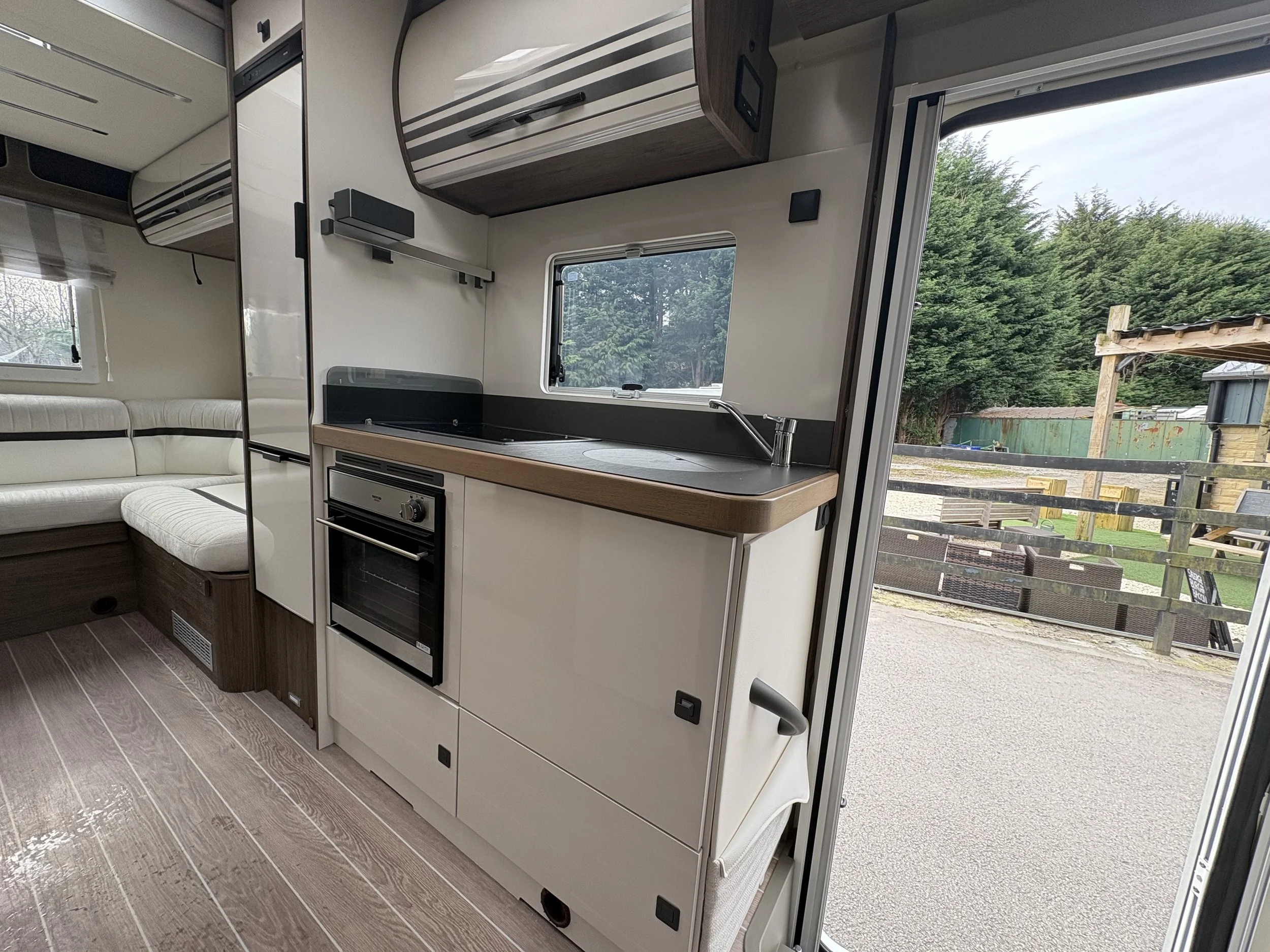 Moving forward, you’ll find a well-equipped central kitchen, designed to provide ample workspace. It includes everything you need for life on the road, from a hob and oven to a fridge-freezer, all neatly integrated to maintain a sleek, practical layout.