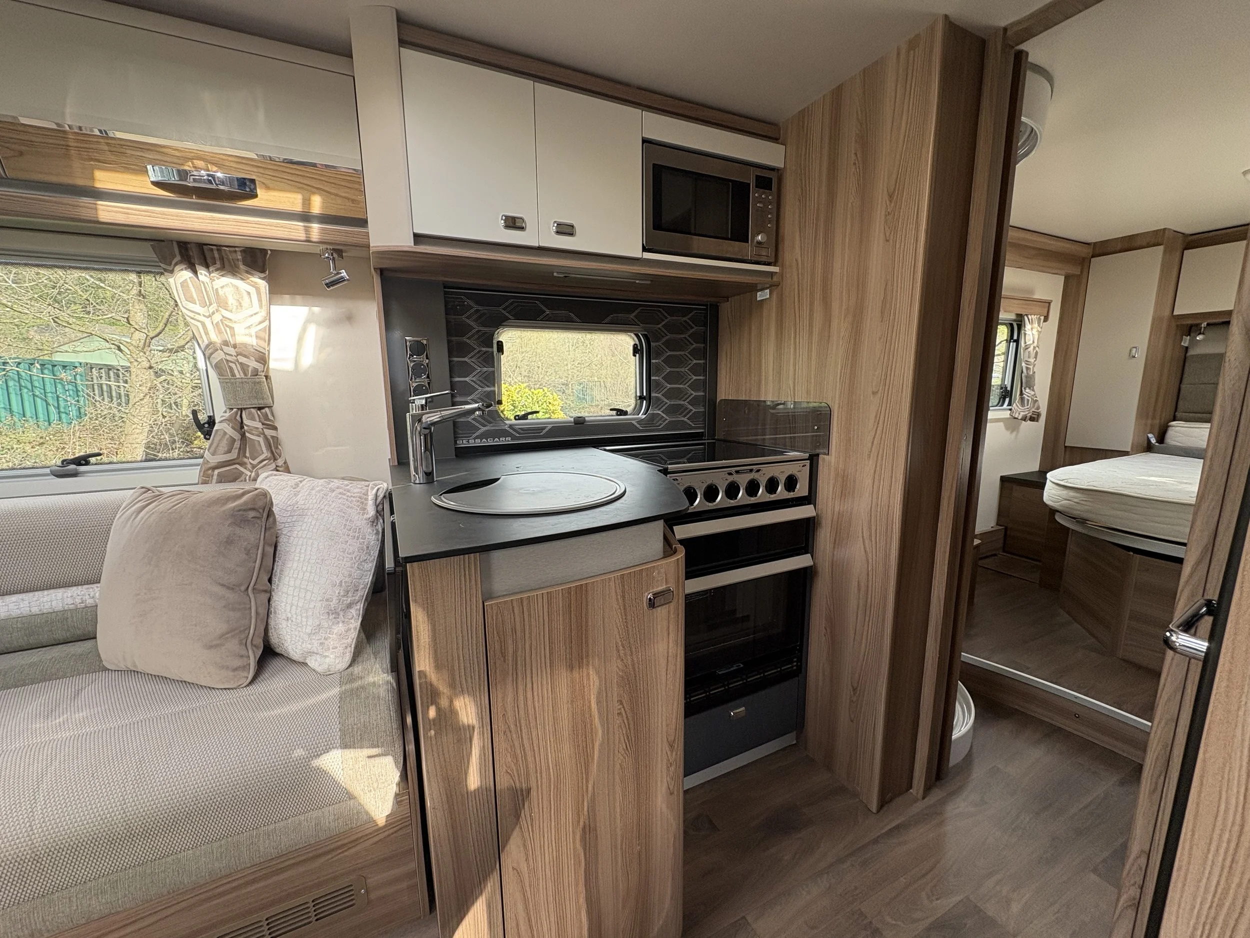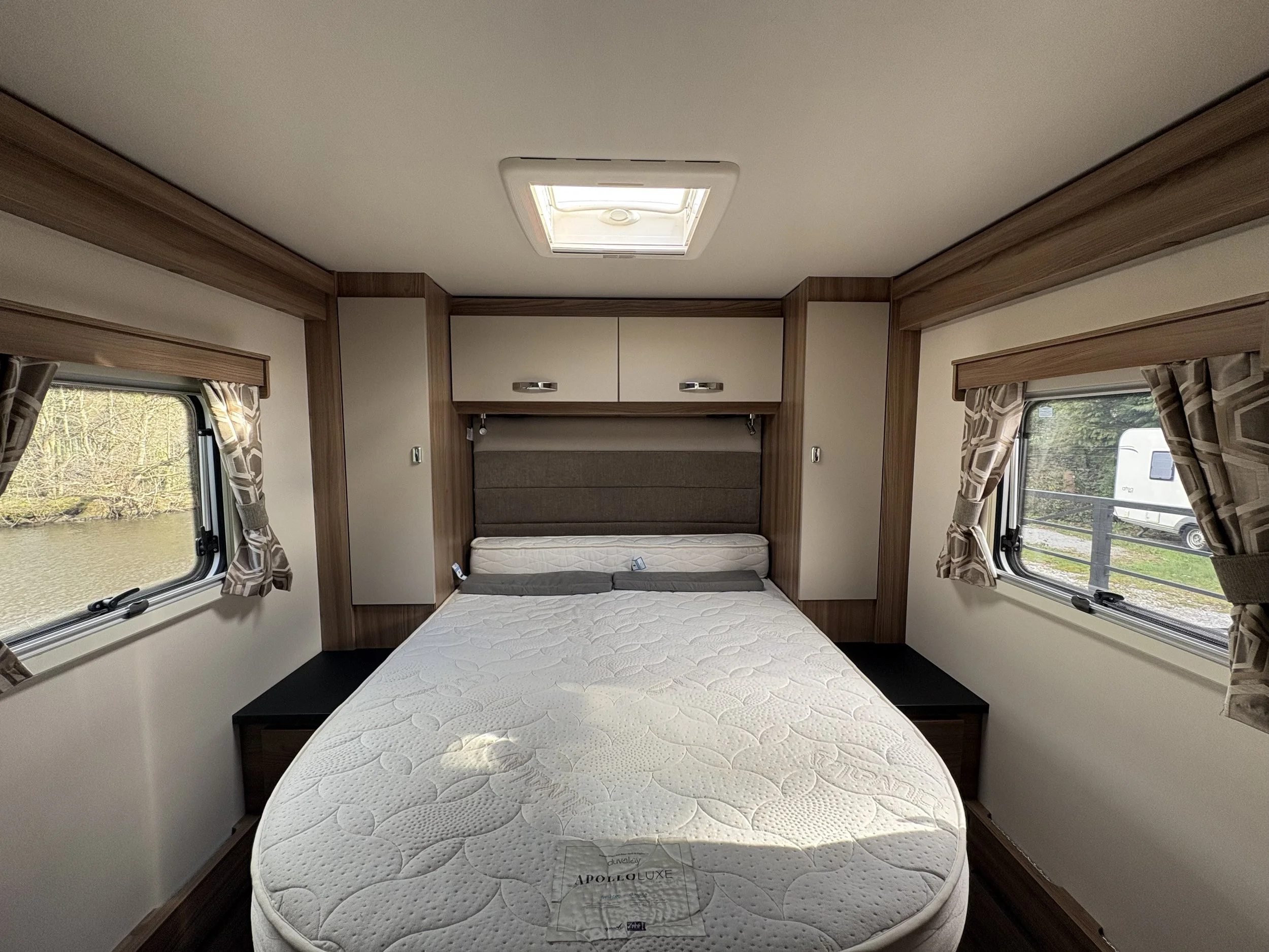 Towards the rear, the standout island bed provides excellent comfort and easy access from both sides, complemented by generous wardrobe space and overhead storage. The full-width washroom separates the shower from the toilet and basin, offering added convenience and a more residential feel.